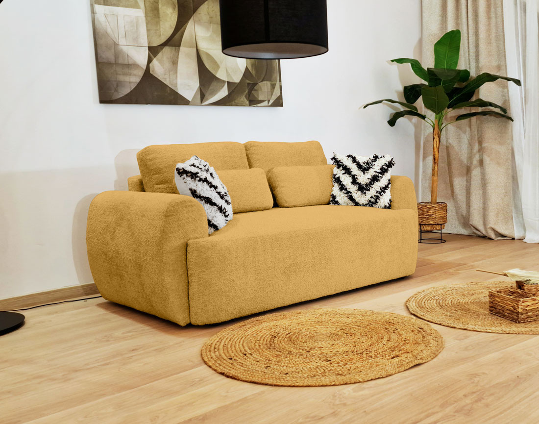 Le canapé droit 2 places Mahina apporte une touche de modernité à votre intérieur. Il combine les qualités d’un design contemporain avec les avantages d’un tissu innovant. Le tissu bouclette est actuellement très prisé dans le design d’intérieur pour sa beauté et sa modernité. Il est tout doux, ajoute du confort à l’ensemble et donne un aspect chaleureux à la pièce. Il est facile à entretenir et très résistant à l’usure. Disponible dans une variété de couleurs tendance, le tissu bouclette permet de personnaliser le canapé pour qu'il s’harmonise parfaitement avec votre intérieur. Jouez également avec les couleurs. Mahina est disponible en plusieurs teintes, ultra tendances : beige, bleu, rose, jaune, taupe, gris clair, gris foncé et rouille.