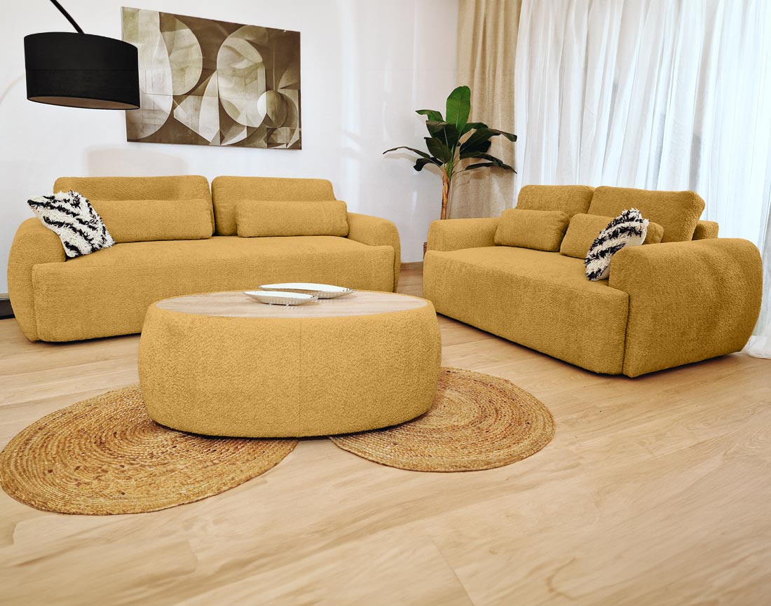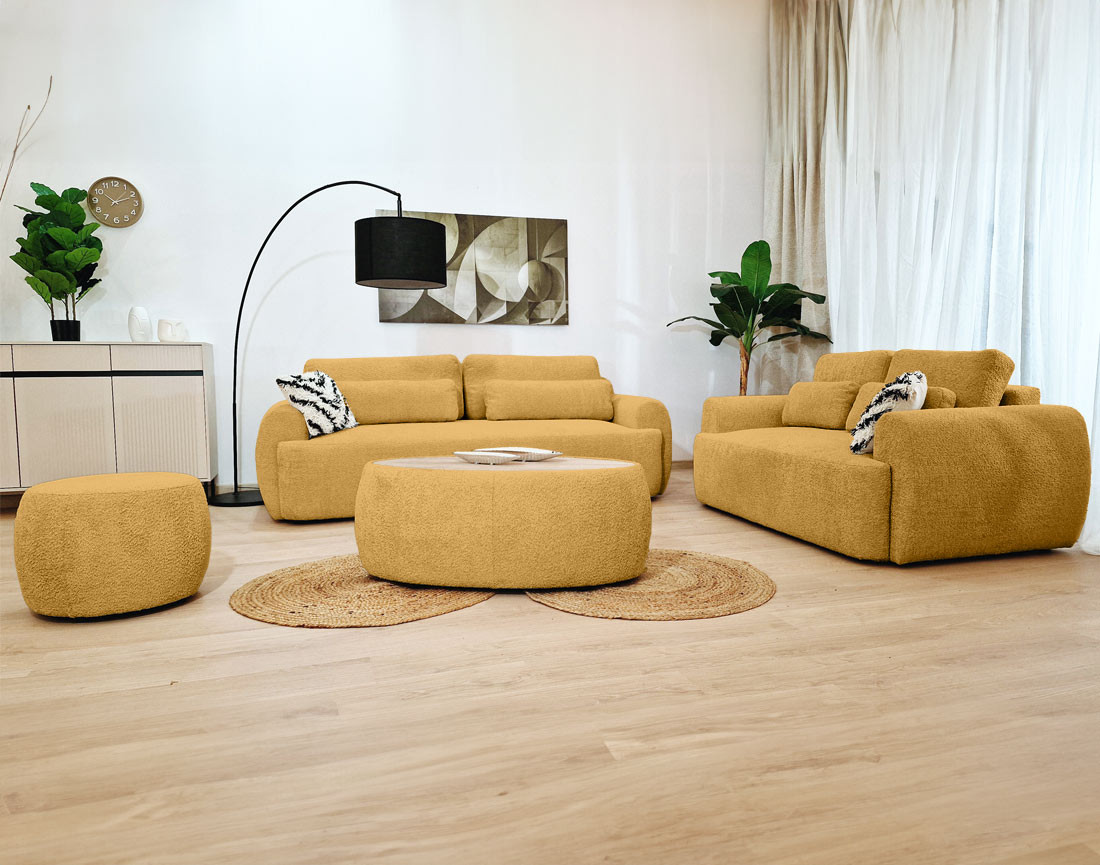 - Présentation de la collection : Puisant son charme dans sa forme organique, ses lignes arrondies et son revêtement en tissu bouclette, la collection Mahina ajoutera du charme à votre salon.