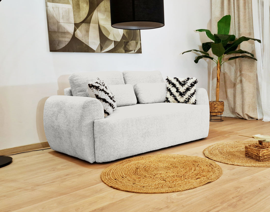 Le canapé droit 2 places Mahina apporte une touche de modernité à votre intérieur. Il combine les qualités d’un design contemporain avec les avantages d’un tissu innovant. Le tissu bouclette est actuellement très prisé dans le design d’intérieur pour sa beauté et sa modernité. Il est tout doux, ajoute du confort à l’ensemble et donne un aspect chaleureux à la pièce. Il est facile à entretenir et très résistant à l’usure. Disponible dans une variété de couleurs tendance, le tissu bouclette permet de personnaliser le canapé pour qu'il s’harmonise parfaitement avec votre intérieur. Jouez également avec les couleurs. Mahina est disponible en plusieurs teintes, ultra tendances : beige, bleu, rose, jaune, taupe, gris clair, gris foncé et rouille.