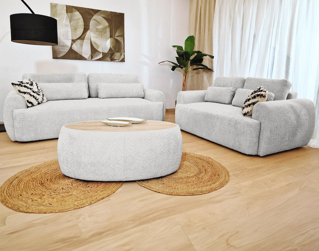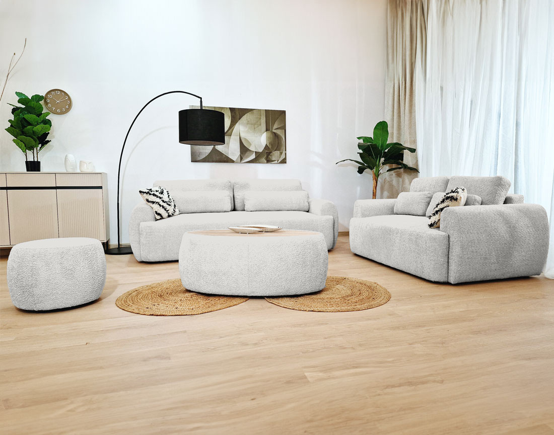 - Présentation de la collection : Puisant son charme dans sa forme organique, ses lignes arrondies et son revêtement en tissu bouclette, la collection Mahina ajoutera du charme à votre salon.