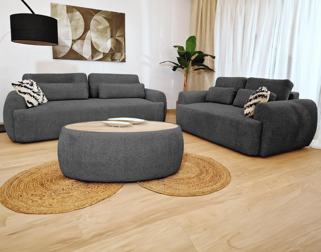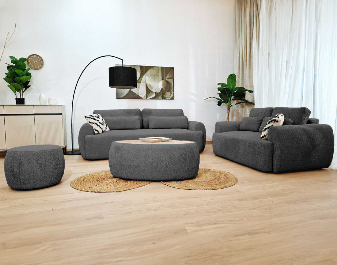 - Présentation de la collection : Puisant son charme dans sa forme organique, ses lignes arrondies et son revêtement en tissu bouclette, la collection Mahina ajoutera du charme à votre salon.