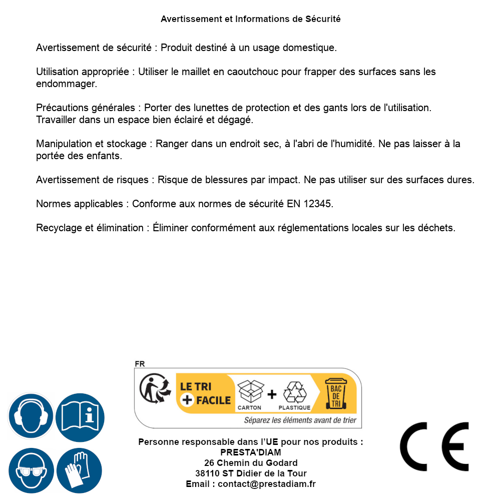 UtilisationPour utiliser le maillet, tenez-le fermement par le manche et frappez doucement la surface souhaitée. Évitez les coups trop violents pour préserver l'intégrité du matériau. Nettoyez le maillet après utilisation pour maintenir sa qualité.