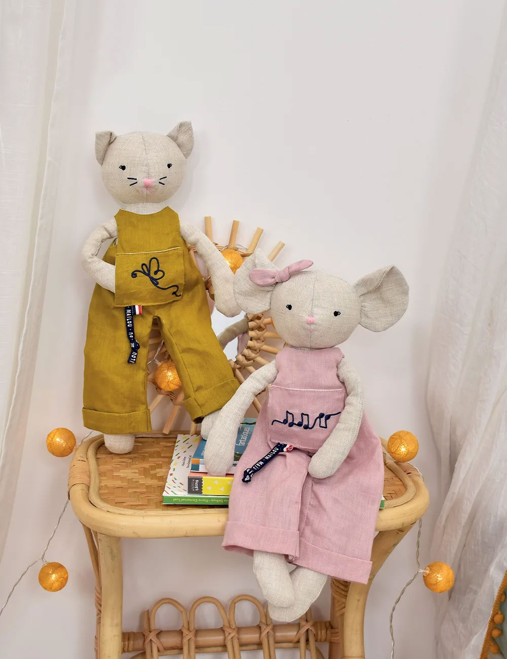 Libellé Mailou - peluche chat olivette en lin avec salopette – perlipopette