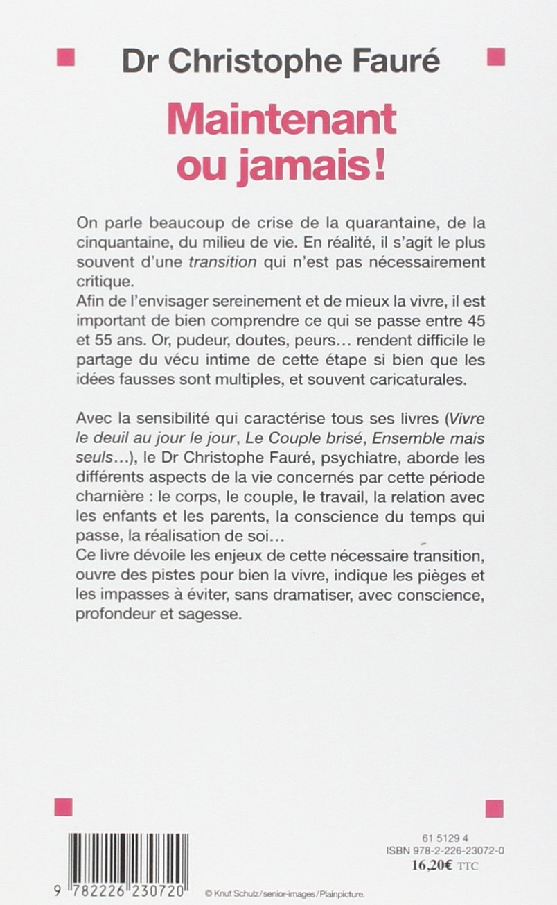 Avec la sensibilité qui caractérise tous ses livres (Vivre le deuil au jour le jour, Le Couple brisé, Ensemble mais seuls...), le Dr Christophe Fauré, psychiatre, aborde les différents aspects de la vie concernés par cette période charnière : le corps, le couple, le travail, la relation avec les enfants et les parents, la conscience du temps qui passe, la réalisation de soi...