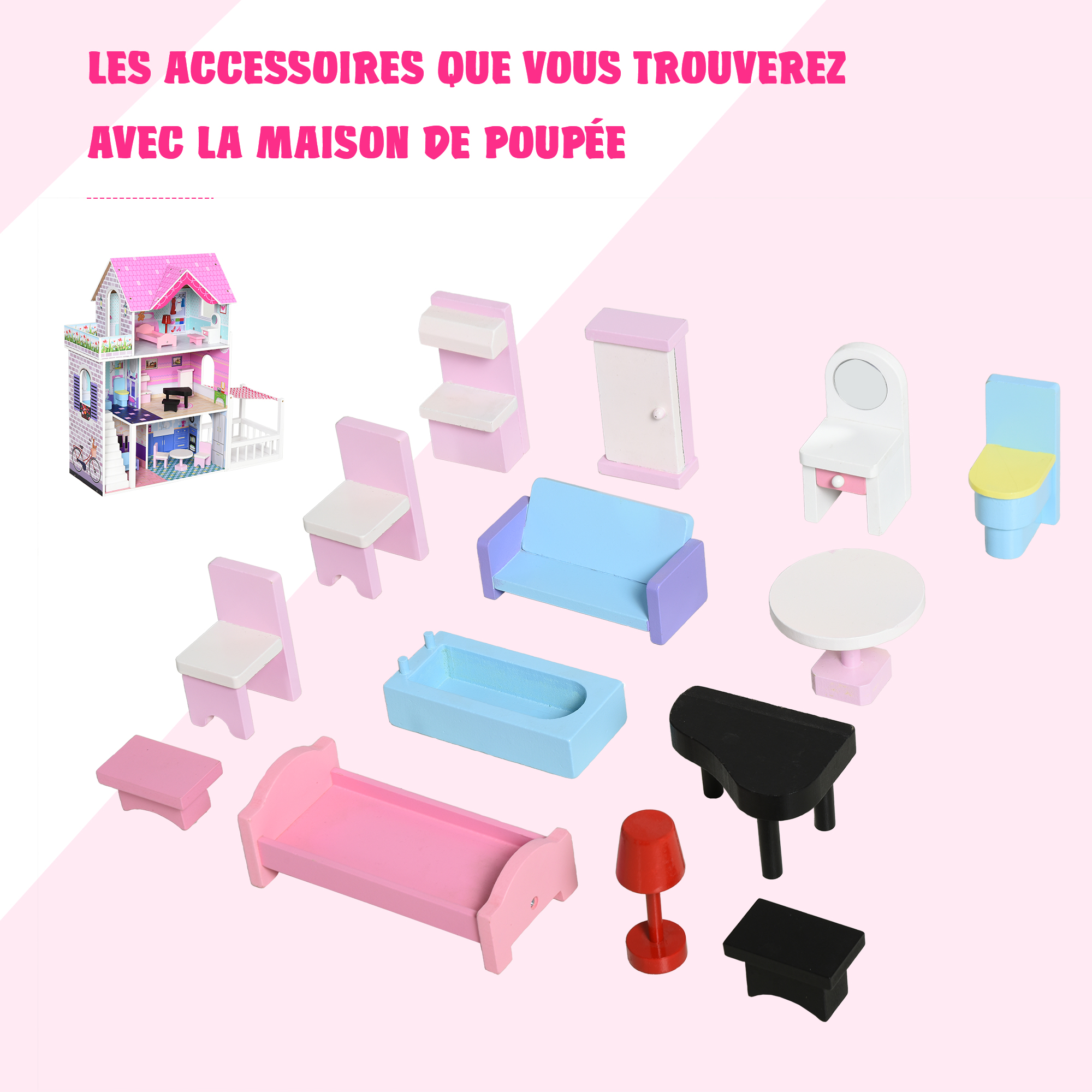 - Accessoires fournis : table à manger, chaises, baignoire, WC, piano, canapé, lit, armoire, coiffeuse, etc...