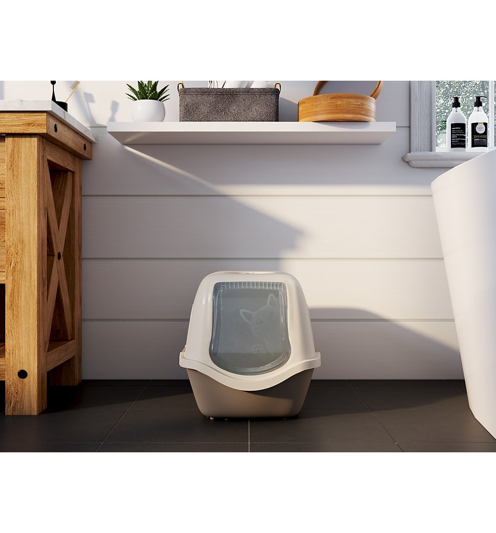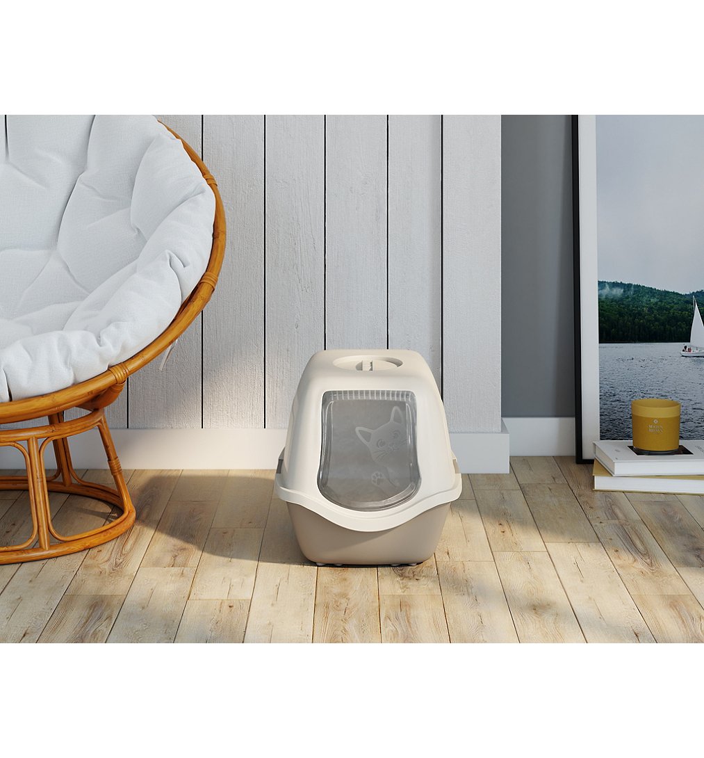 L. 55,2 x l. 39 x H. 38,7 cm Couleur Taupe. En matière recyclée. Filtre anti-odeurs Porte battante Facile à transporte