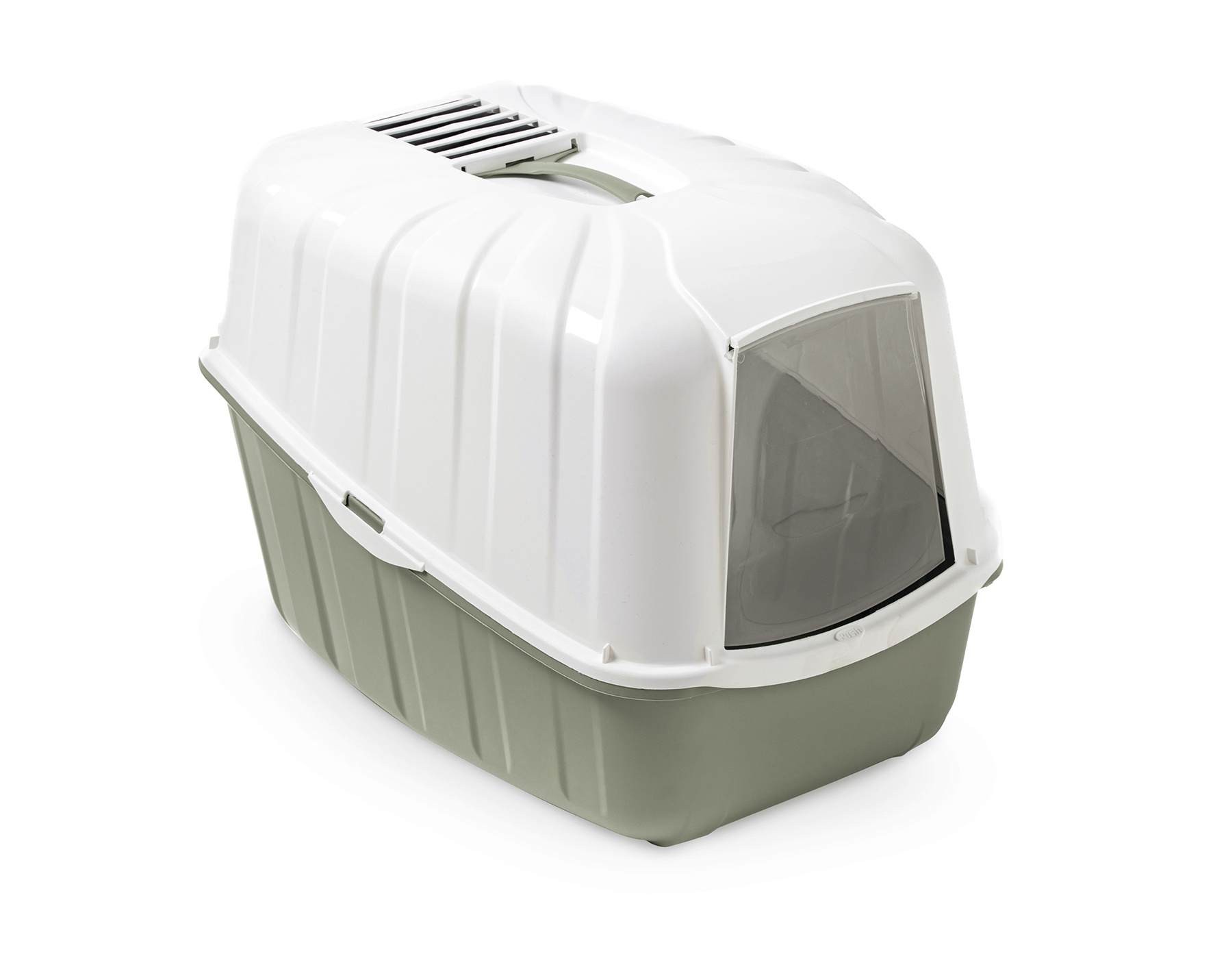 Maison de toilette pour chat avec porte battante transparente et poignée de transport. A la fois pratique et esthétique, elle est livrée avec un filtre et une pelle à litière. Dimensions : L54 x l39 x H39 cm