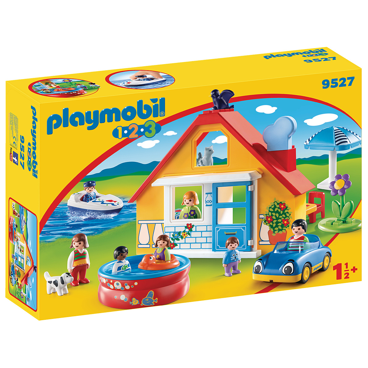 Vive les vacances dans la jolie maison 1.2.3 ! Les enfants profitent de la piscine. Papa a prévu de faire une balade en bateau Avec sept personnages, trois animaux, un bateau qui flotte, une voiture et des meubles. La piscine peut être remplie d'eau.