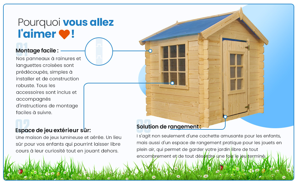 | Libellé | Maison en bois pour enfants - 0.9 m2 - 111 x 113 cm - Toit bleu - SANS PLANCHER - Timbela M570M-1 |