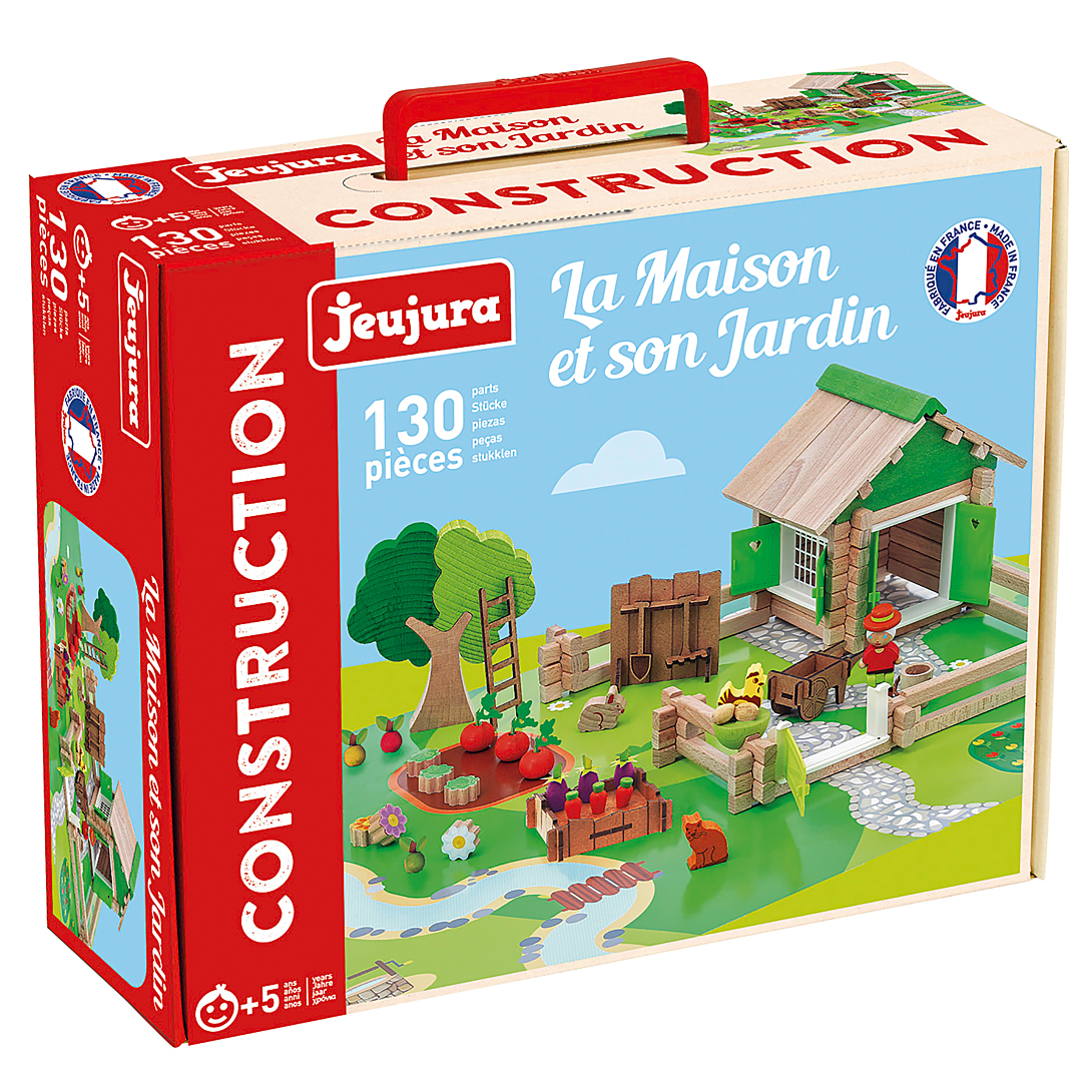 La Maison et son Jardin - 130 pièces : jeu de construction en bois naturel et teinté avec une notice de montage, un tapis de jeu et de nombreux accessoires pour aménager son jardin. Valisette carton : 32 x 27 x 11 cm. A partir de 5 ans.