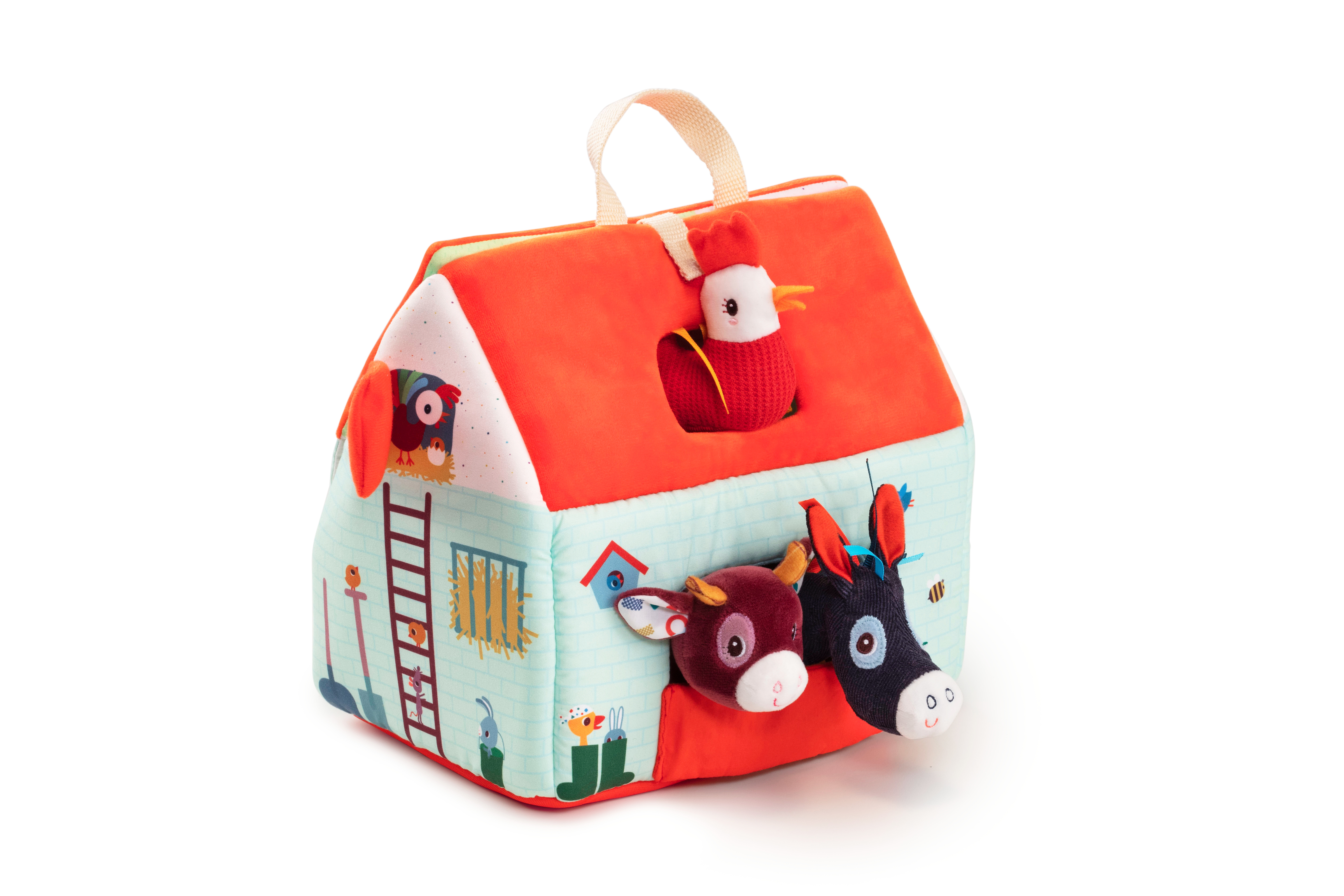 Quelle joyeuse animation à la ferme de Barnabé. Ignace l'âne, Simon le cochon, Rosalie la vache, Yvon le mouton, Paulette la poule et Gaspard le canard sont les habitants hauts en couleur de la ferme. Barnabé, le fermier, circule sur son tracteur et veille à ce que tout se passe bien. Chaque habitant a sa place à la ferme. Grâce à la fermeture et à la poignée, vous pouvez facilement emporter la ferme et ses habitants.