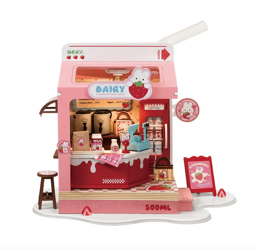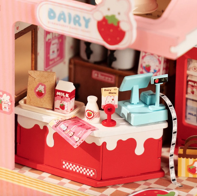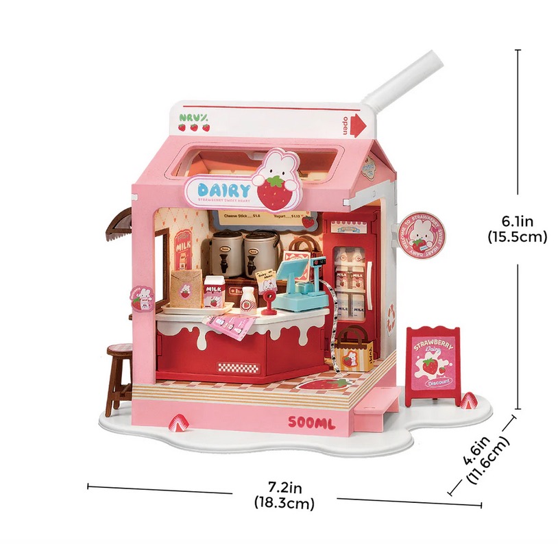 Cette nouvelle maison est conçue en forme de boîte de lait à la fraise. La couleur rose et les éléments fraise le rendent très mignon. Après 1,5 heure d'assemblage, il peut constituer un décor délicat et être utilisé pour des jeux de simulation.