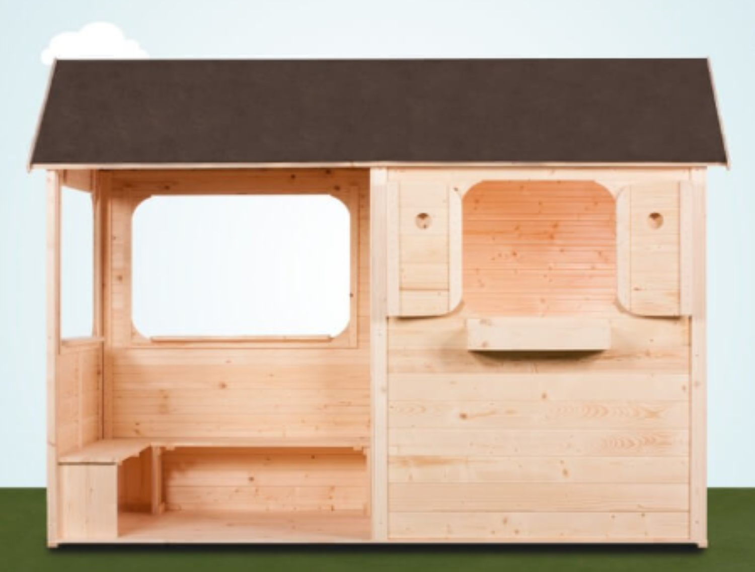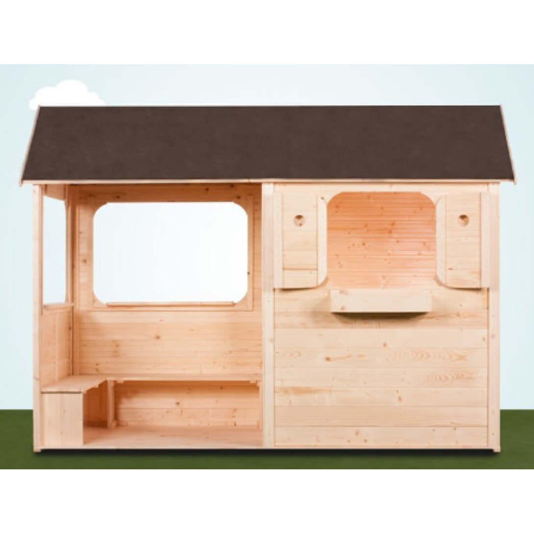 Cette maison en bois enfant dispose d'une grande terrasse abritée . Votre enfant pourra jouer aussi bien dans sa maison qu'à l'abri sur sa terrasse. La terrasse est même équipée d'un banc sur lequel votre enfant pourra tranquillement s'adonner à ses jeux favoris. Il pourra accéder de sa terrasse directement dans sa maison sans avoir à passer dehors. Vous pourrez stocker tous ces jouets bien à l'abri sous la terrasse. Un très grand terrain de jeu en perspective. Plancher intégral dans toute la maison.