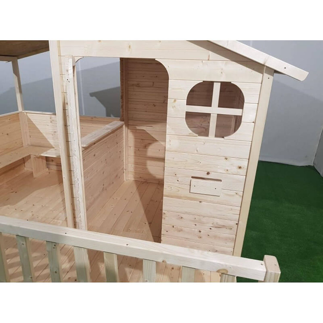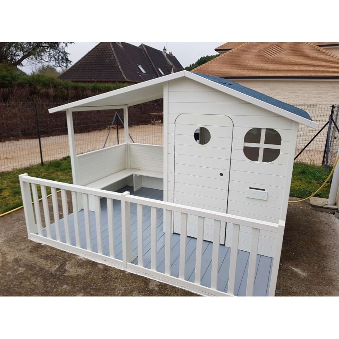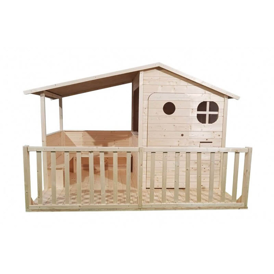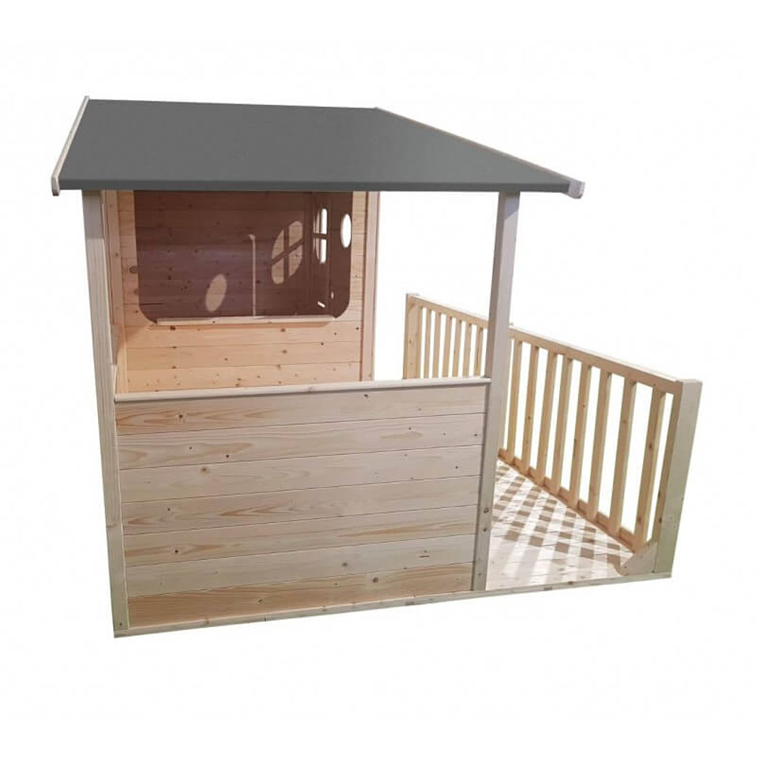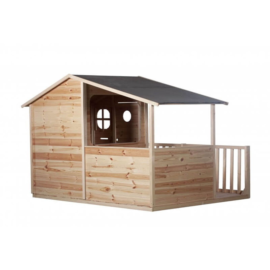La maison MASSA est un modèle XL spécialement conçu pour les grandes tribus ! Plusieurs enfants peuvent jouer en même temps dans la cabane ou sur la terrasse. Une fenêtre panoramique leur permet d’échanger et de jouer ensemble sans être séparés. La cabane possède un grand toit en feutre bitumé qui couvre la terrasse : idéal pour jouer à l’ombre ou protégé de la pluie; Équipements de la maisonnette enfant : Espace de jeu intérieur avec plancher en bois Terrasse couverte avec banc d’angle et barrières 2 fenêtres : 1 en plexiglas avec croisillon et 1 panoramique Toit goudronné à double pente Porte pleine en bois