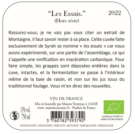 | Libellé | Maison Ventenac "Les Essais" BIO, 2022 - Vin de France - Rouge - 75 cl |