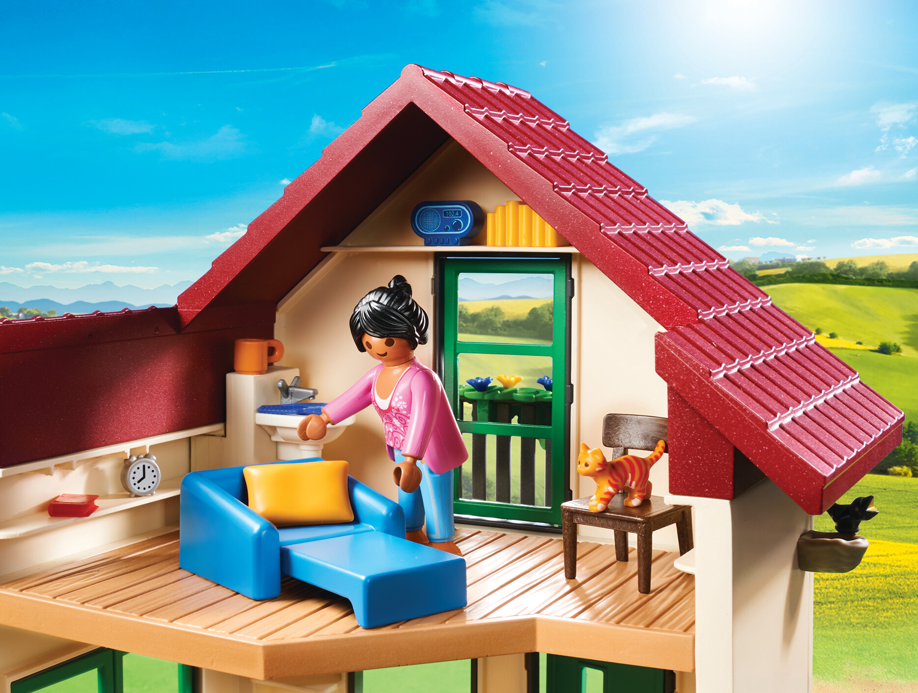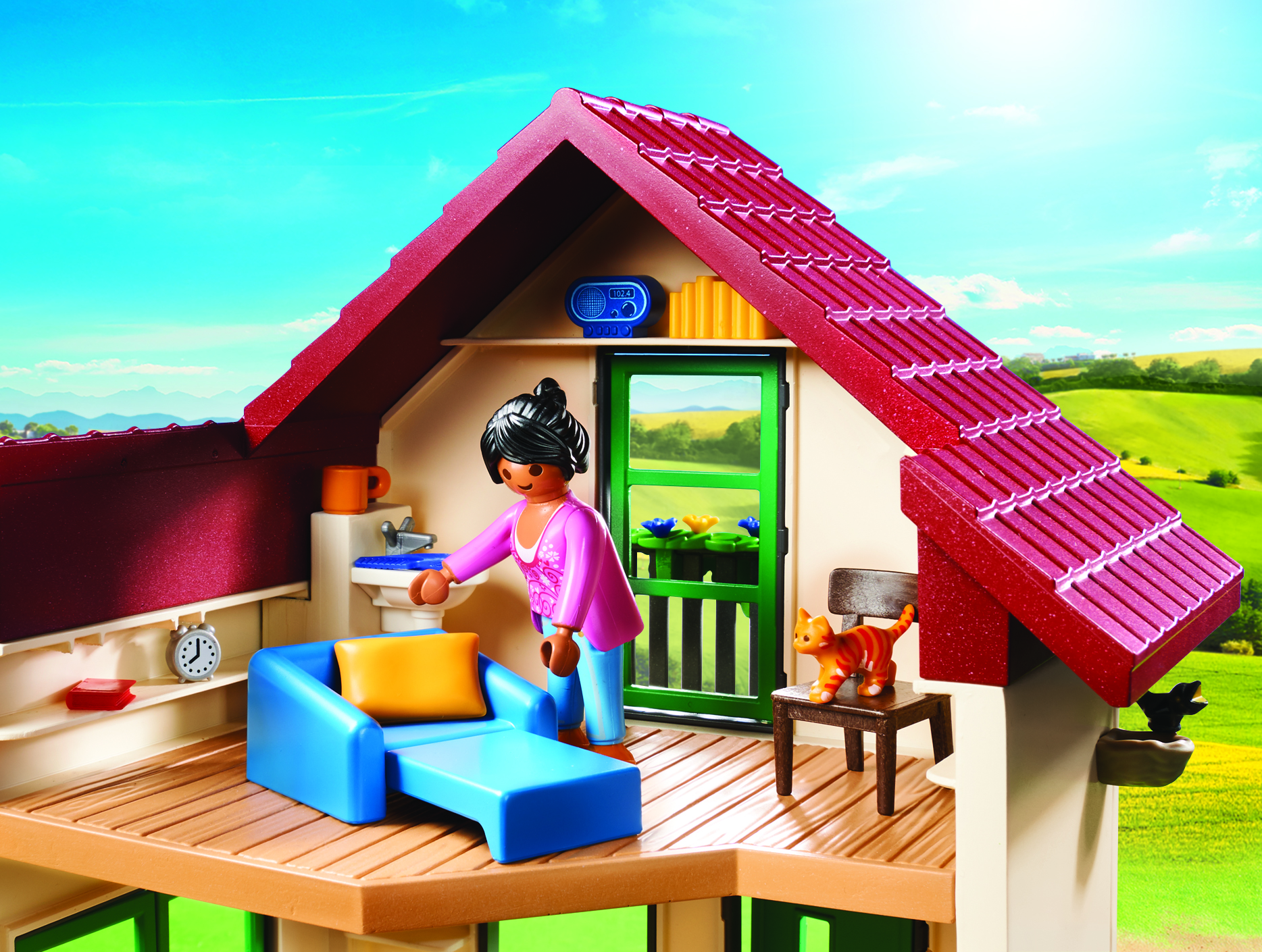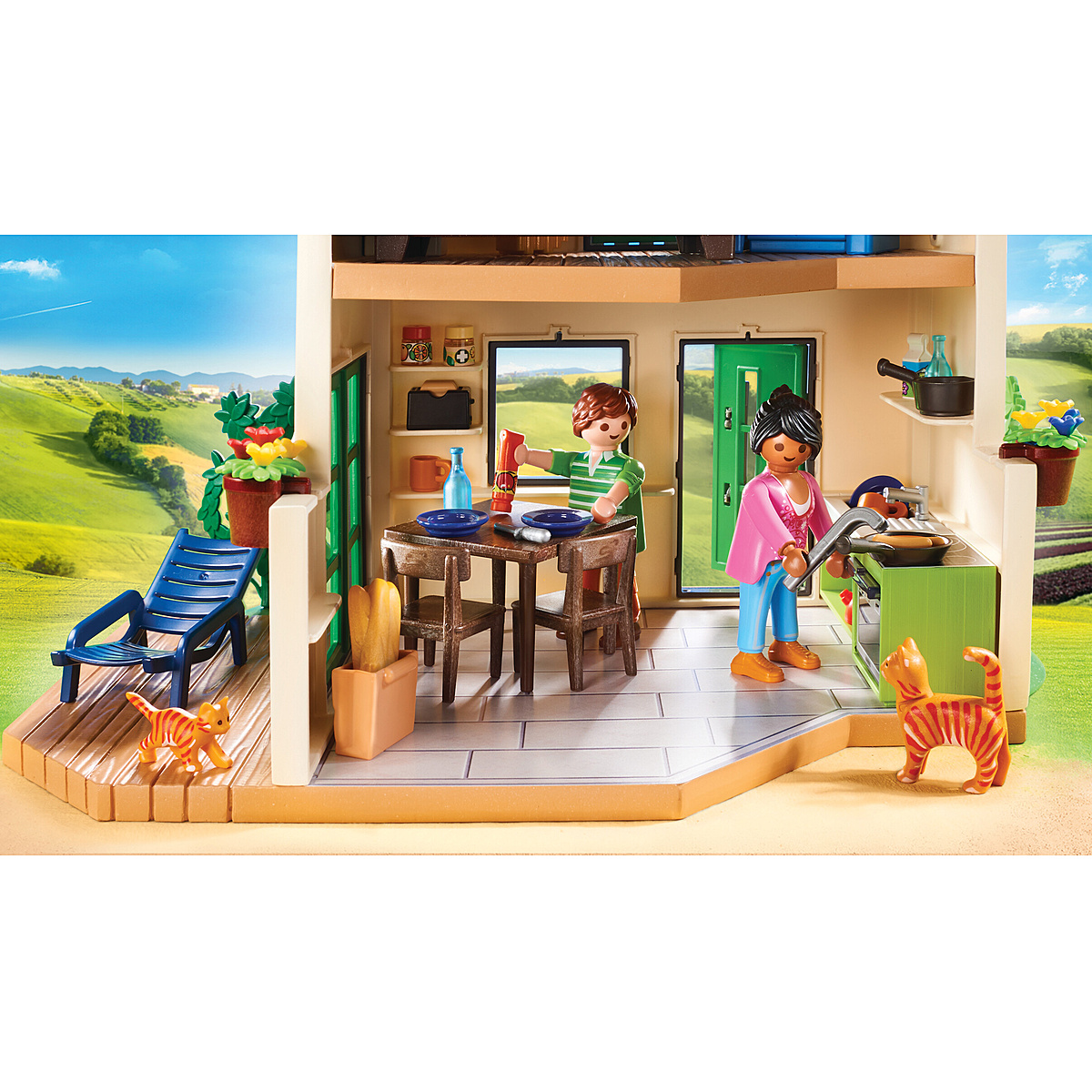 Contient 1 balcon et 1 terrasse, 2 personnages, des animaux (chèvres, chats) un enclos pour les chèvres et des accessoires (mobilier, aliments, ustensiles)