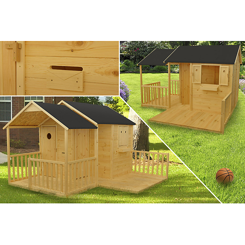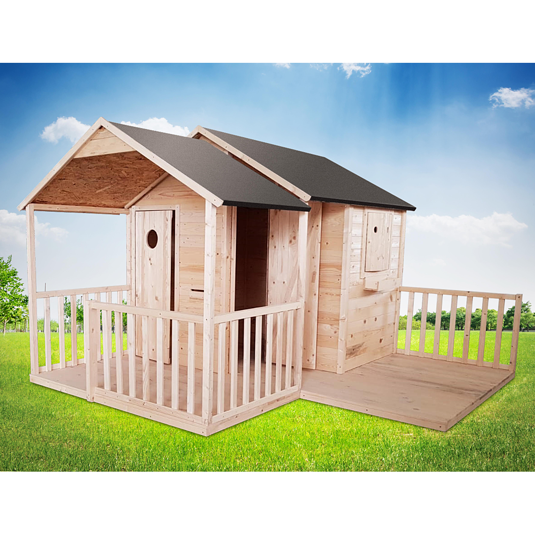 Les enfants ont enfin leur propre chez soi ! La maison XL DEVA leur offre un grand espace intérieur avec plancher en bois, deux portes pour entrer et sortir sans se gêner, deux grandes terrasses dont une sous patio couverte pour continuer à jouer tout en étant protégé de la pluie. La maison est équipée de : 2 grandes terrasses avec barrières 2 portes pleines en bois Fenêtre avec volets ouvrants Toit en goudron double pente Boîte aux lettres