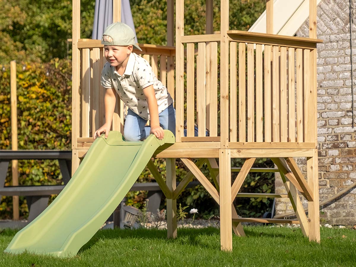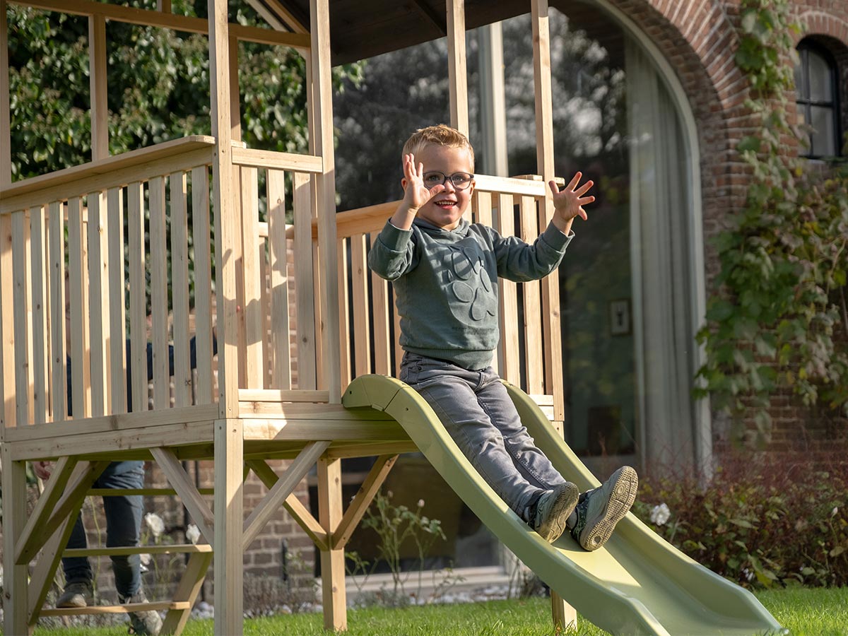 La maisonnette en bois sur pilotis avec toboggan EXIT Panorama 300 porte bien son nom : tes enfants profiteront d'une vue panoramique sur l'ensemble du jardin ! Elle offre la possibilité de jouer à plusieurs enfants en même temps. En effet, la maison a une conception ouverte, ce qui permet aux enfants de l'intégrer facilement à leurs jeux extérieurs. Ils peuvent entrer dans la maisonnette en montant les marches et redescendre en glissant par l'autre côté. Grâce à sa conception accessible, la maisonnette d'extérieur est sûre et confortable, même pour les plus jeunes enfants. De plus, tu as toujours une vue sur tes petits. Tu peux donc laisser tes enfants profiter de l'espace pour jouer librement et s'amuser ensemble sans soucis ! Depuis la plate-forme, ils montent la garde ou descendent le toboggan à toute allure. En effet, la vue à 360 degrés du jardin leur permet de garder un œil sur toutes les cachettes possibles lors d'une partie de cache-cache. Ou bien la tour de guet va-t-elle être utilisée pour observer la nature ? Avec des jumelles, tes enfants chercheront les oiseaux et découvriront les différentes espèces d'arbres du jardin. Peut-être transformeront-ils la plateforme en une scène pour s'adresser à tous, comme de vrais maires. Les possibilités de jeu avec la maisonnette Panorama d'EXIT Toys sont infinies ! La maisonnette en bois pour l'extérieur est fabriquée en bois de cyprès certifié FSC® de haute qualité (FSC 100 %, FSC® SCS-COC-007799). Ce type de bois est naturellement résistant aux conditions climatiques telles que la pluie, le soleil et la neige. La pourriture n'a donc aucune chance ! Cela signifie une durée de vie plus longue et donc plus de plaisir à jouer. Elle nécessite également moins d'entretien, idéal ! Comme nous choisissons volontairement du bois provenant de forêts certifiées FSC, tu peux être sûr(e) que cette maisonnette de jeux pour le jardin est respectueuse de l'environnement. Caractéristiques techniques Âge:2 ans et + Couleur:Bois Dimensions (L x l x H):226 x 120 x 203 cm Garantie:2 ans Marque:EXIT TOYS Matière(s):Bois Montée sur pilotis:Oui Plancher:Oui Poids:34 kg Traitement:NC Type de bois:Cyprès