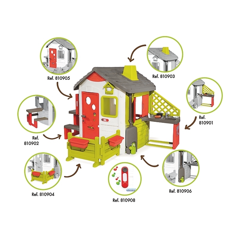Cette cabane a été spécialement conçue pour que vous puissiez y ajouter les accessoires que vous souhaitez : cuisine d'été, table pique-nique, cheminée, porte d'entrée, sonnette d'entrée, récupérateur d'eau, et espace jardin. Vous pourrez créer alors LA maison qui correspond le plus à vos petits !