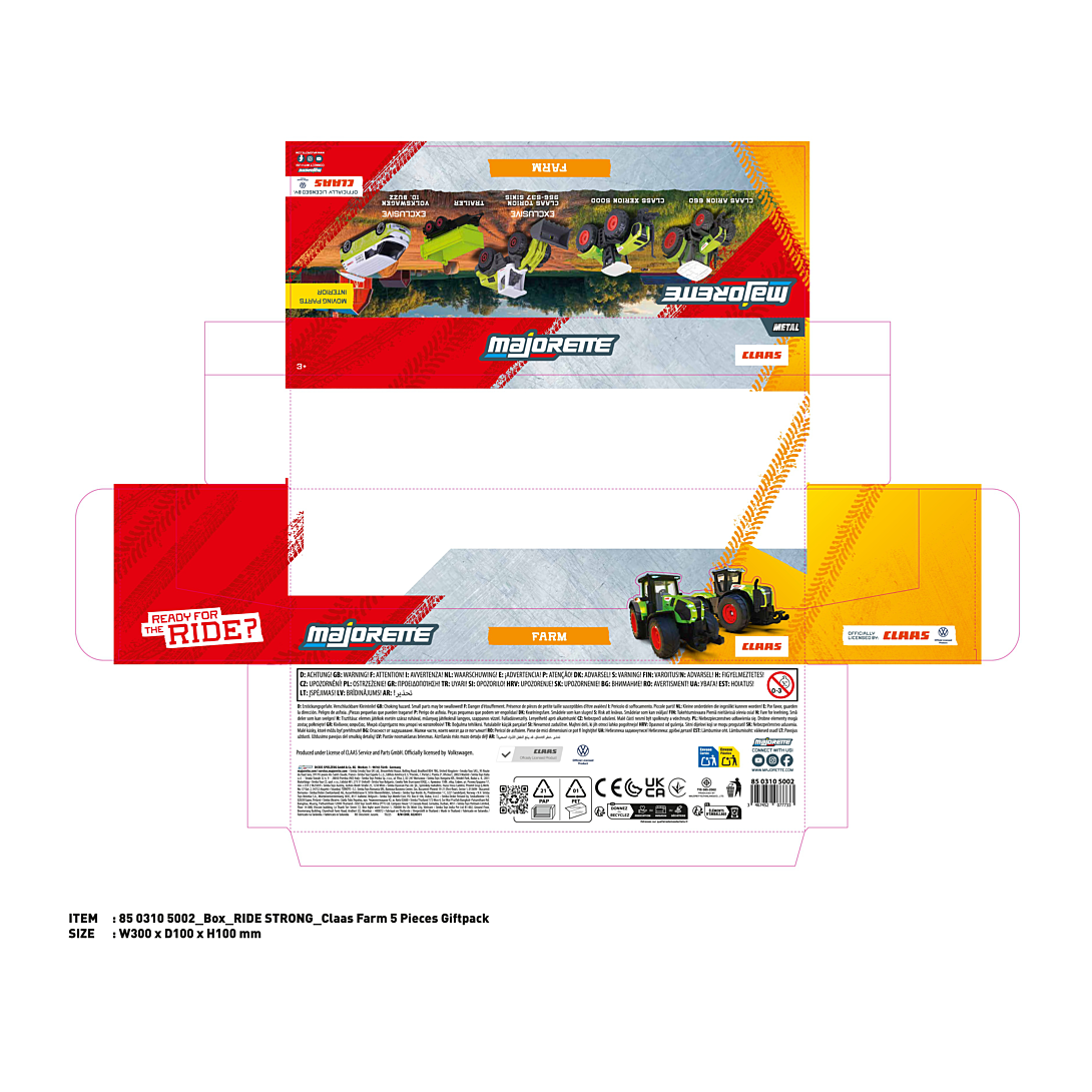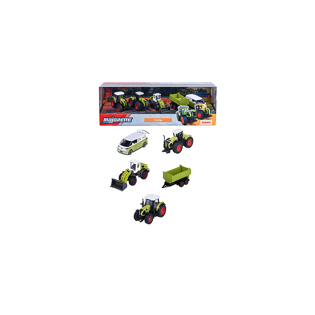 Coffret de 5 véhicules en métal à roue libre. Reproductions originales à l'échelle 1/64ème (7,5cm) des véhicules agricoles sous la licence CLASS : tracteurs, chargeuse, camion de dépannage. Fonctions de jeu : - Parties mobiles - Phares translucides - Suspensions