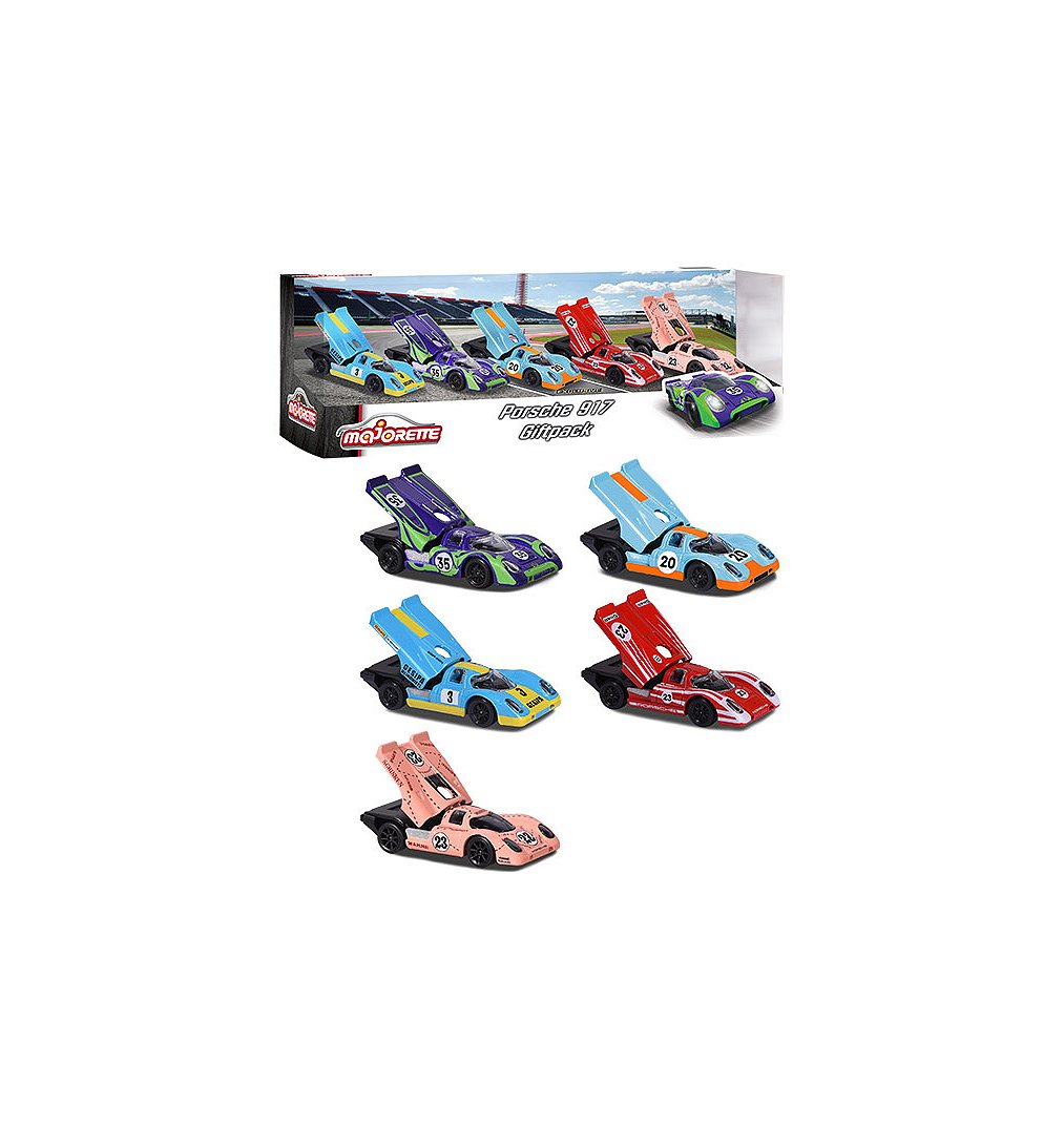 | Plus produit | Coffret de 5 véhicules métal reproductions à l\'échelle 1/64ème de modèles Porsche 917. Portes ouvrantes, phares translucides, suspensions. |