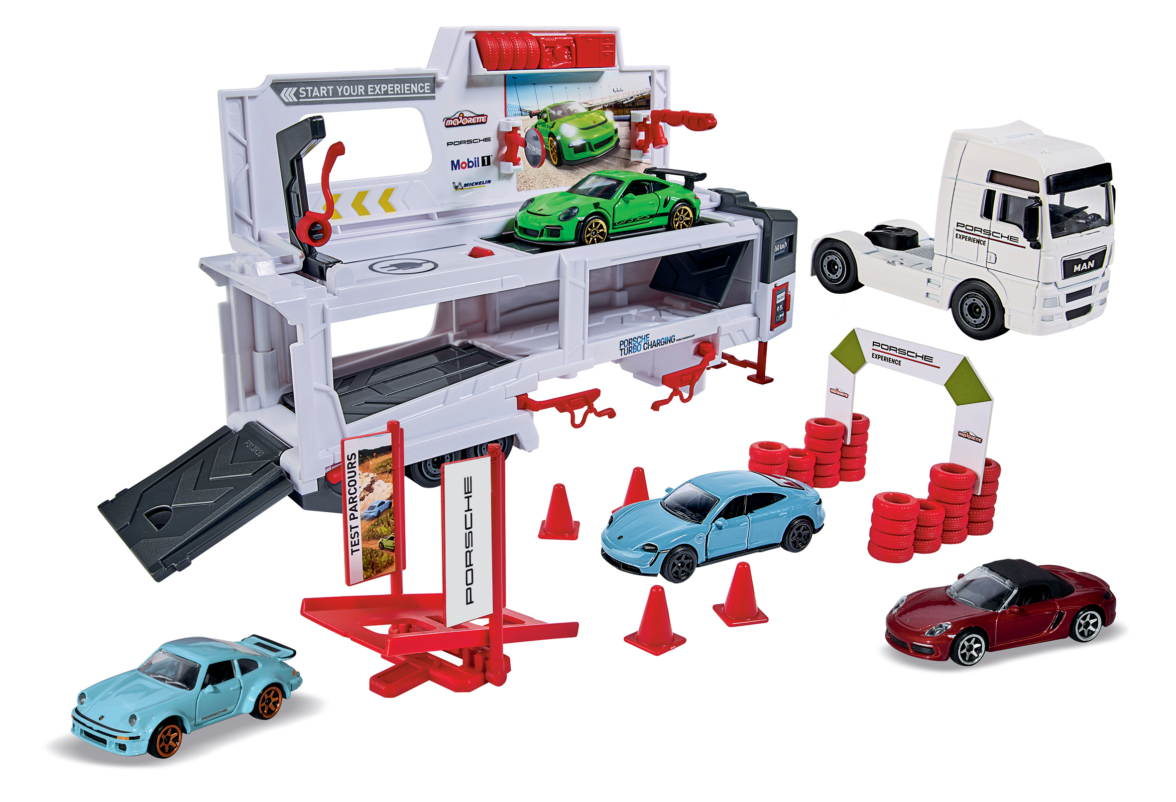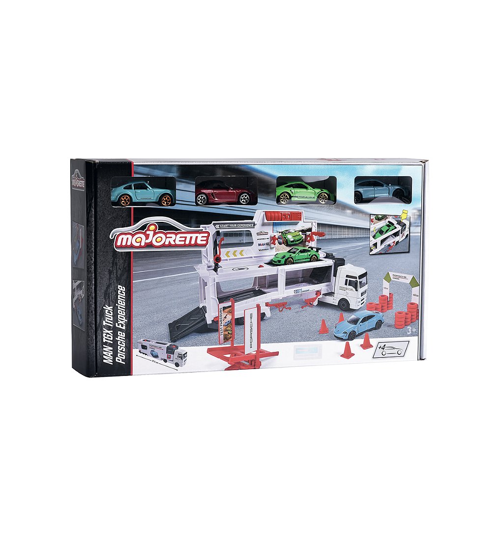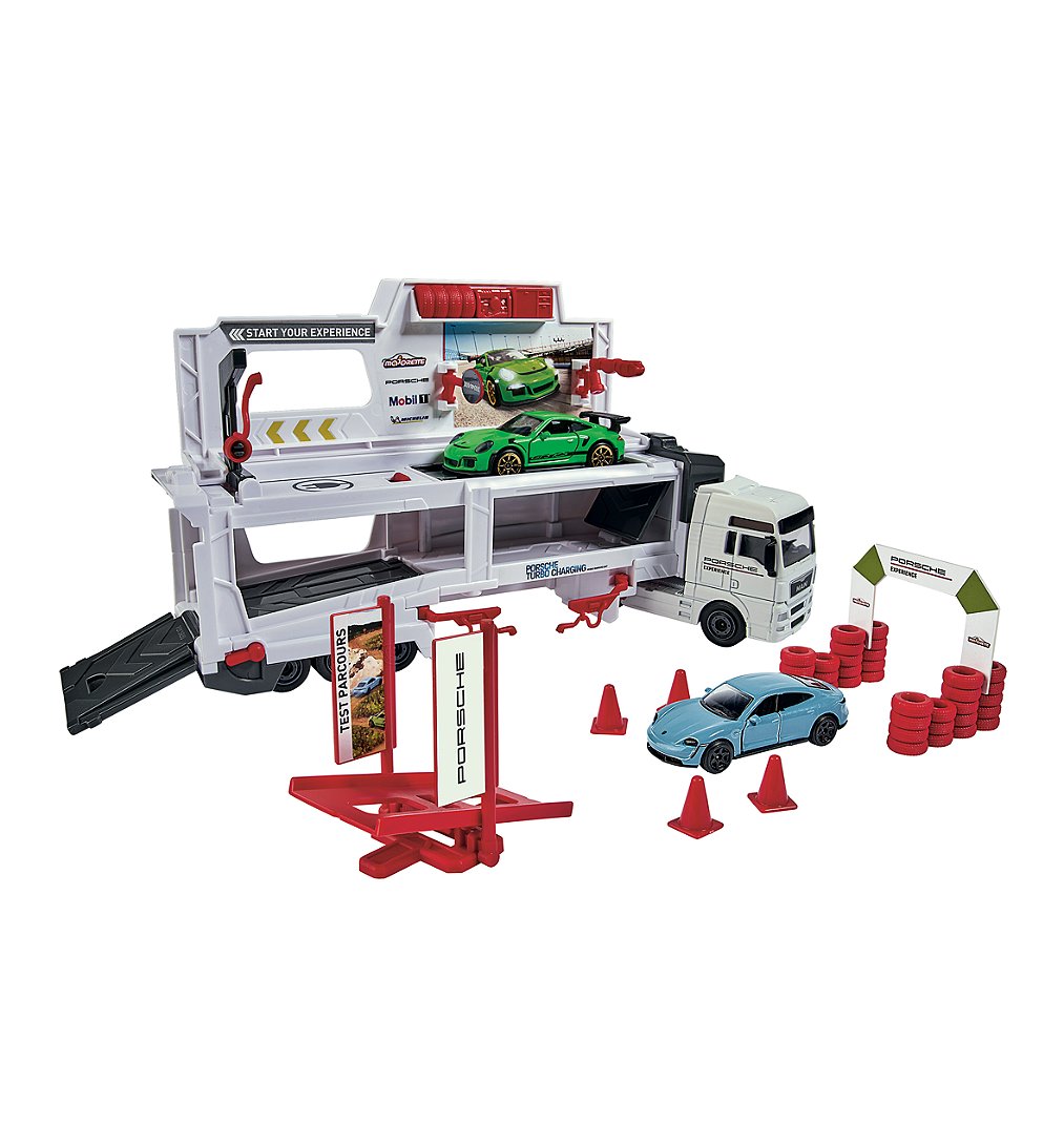 Camion 27cm sous licence Porsche. Playset pliable avec des parties mobiles. Plusieurs lanceurs inclus pour faire sortir les véhicules du camion facilement. Nombreux accessoires amovibles inclus : pneus et plots pour créer un parcours racing. Possibilité de ranger 2 véhicules à l'intérieur. 4 véhicules inclus. A partir de 3 ans