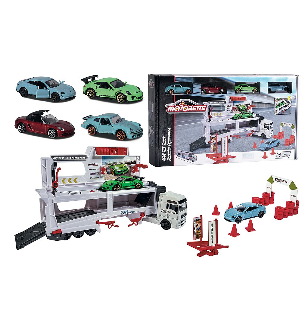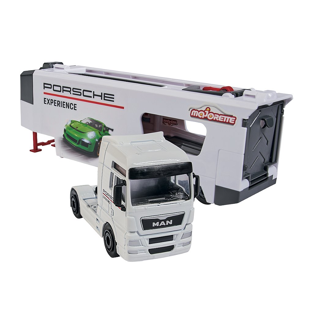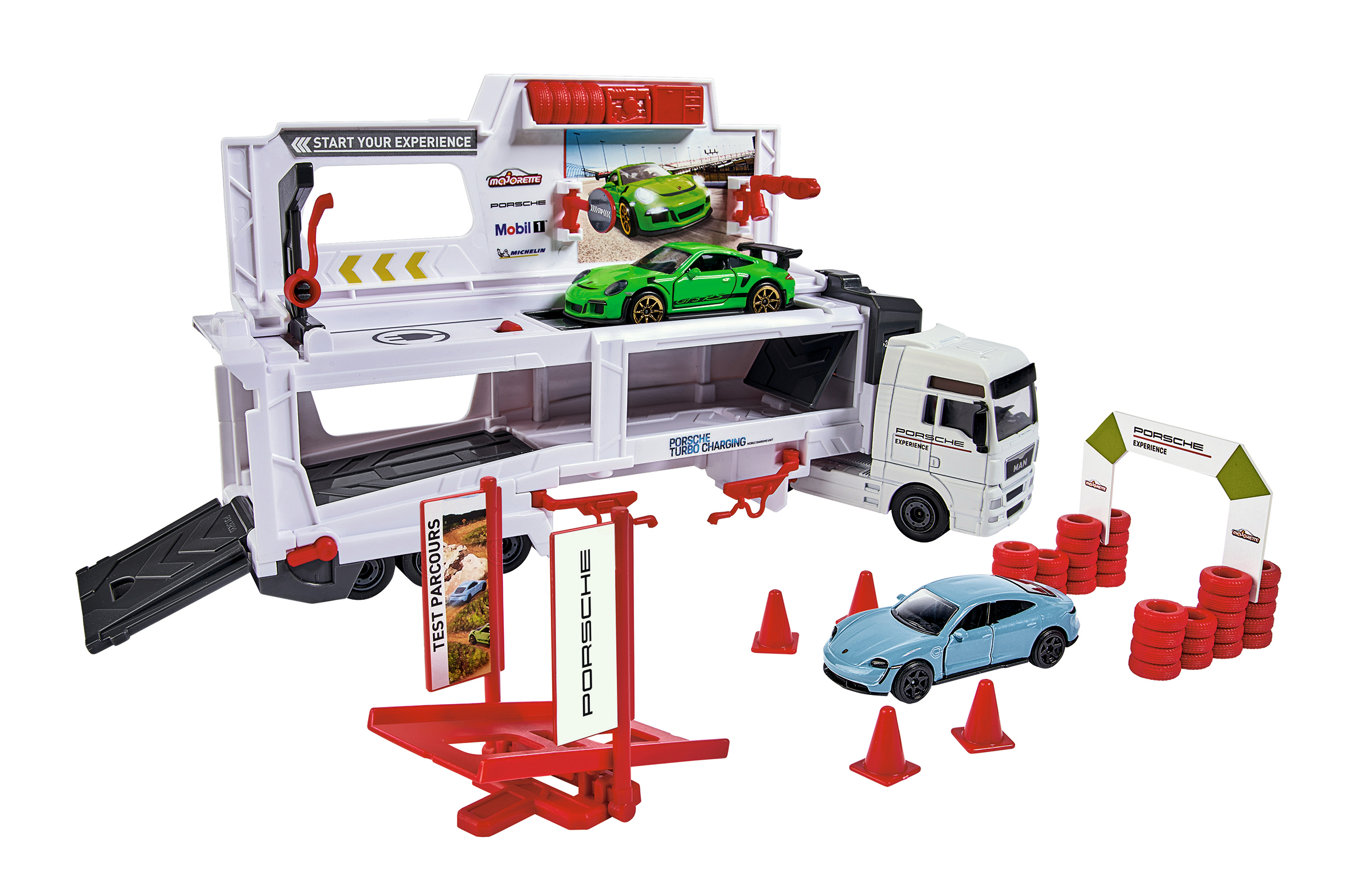 Camion 27cm sous licence Porsche. Playset pliable avec des parties mobiles. Plusieurs lanceurs inclus pour faire sortir les véhicules du camion facilement. Nombreux accessoires amovibles inclus : pneus et plots pour créer un parcours racing. Possibilité de ranger 2 véhicules à l'intérieur. 4 véhicules inclus. A partir de 3 ans