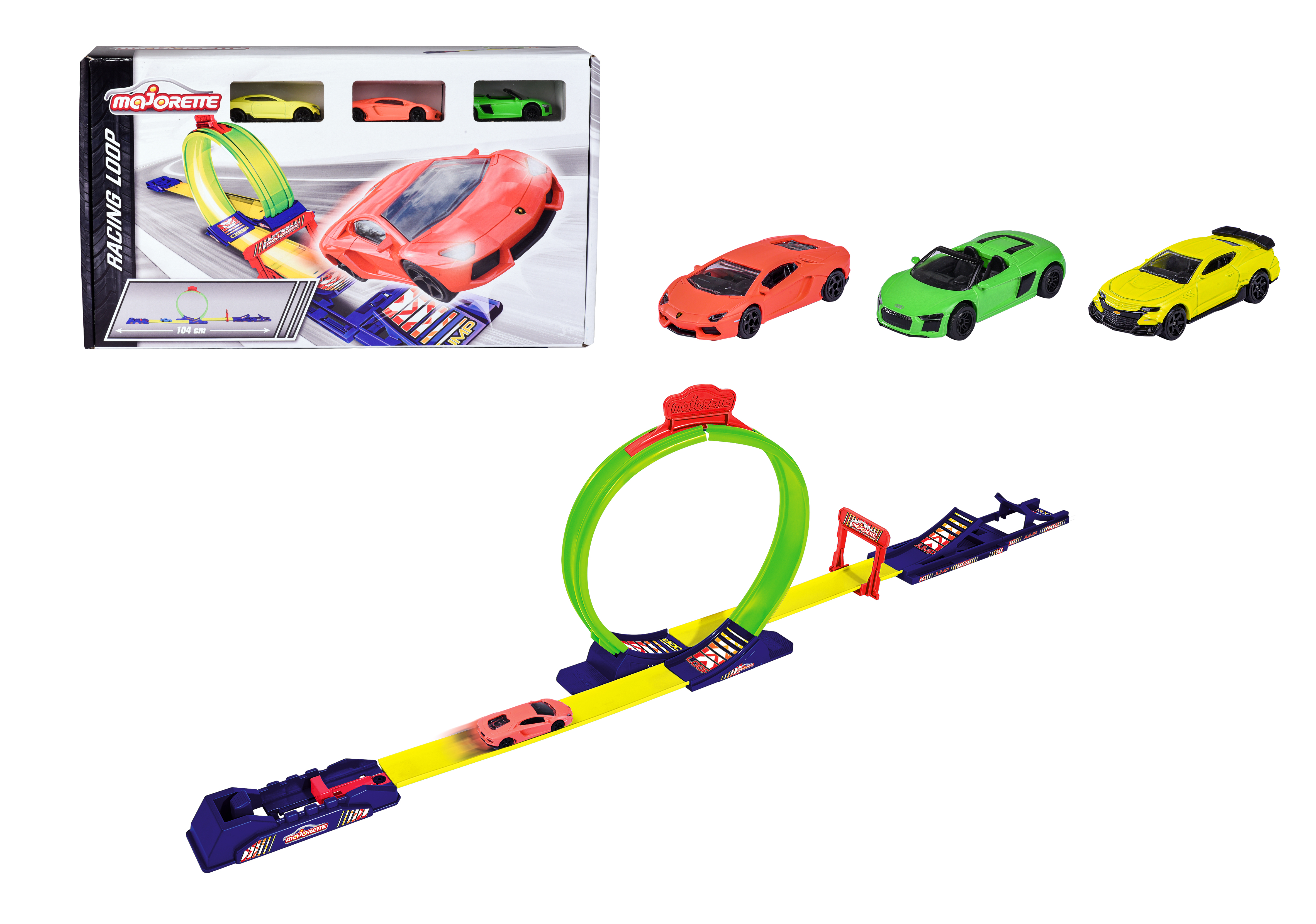 Piste avec lanceur de voiture, un looping et un saut ultime en fin de piste. Piste avec des couleurs vives sur le thème du racing. 3 véhicules Majorette inclus