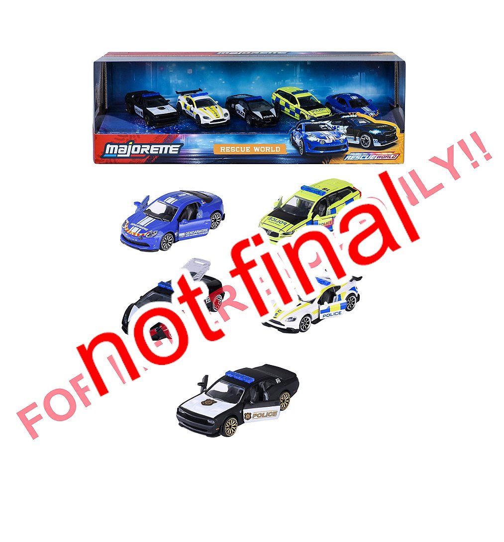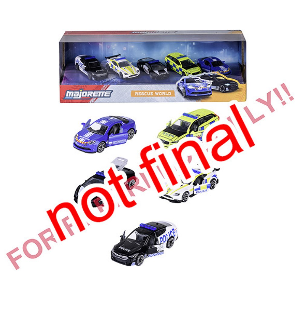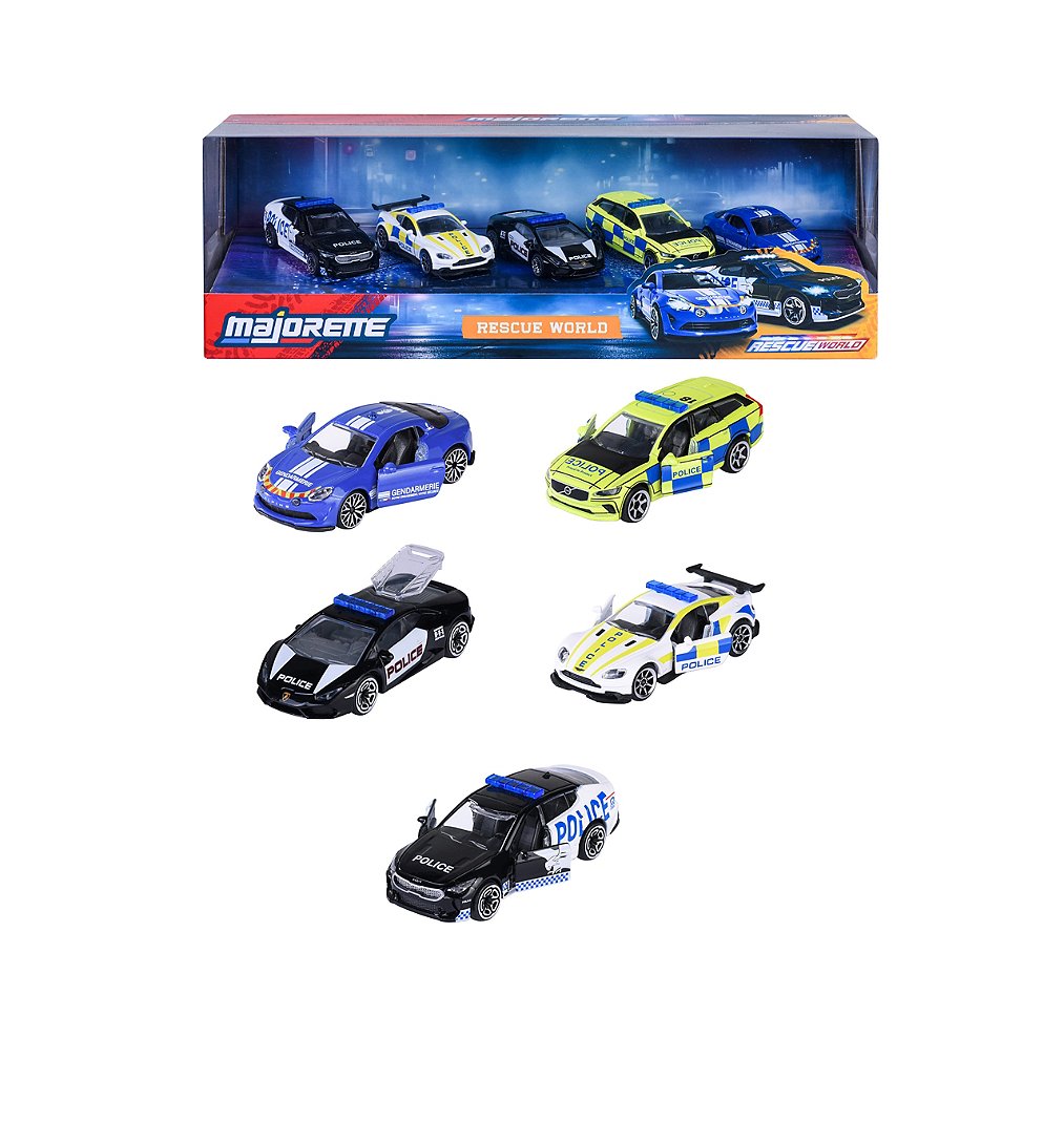Coffret de 5 véhicules en métal à roues libres. Reproductions originales des véhicules de secours européens à l'échelle 1/64ème : Fonctions de jeu : - Portes ouvrantes - Phares translucides - Suspensions A partir de 3 ans.
