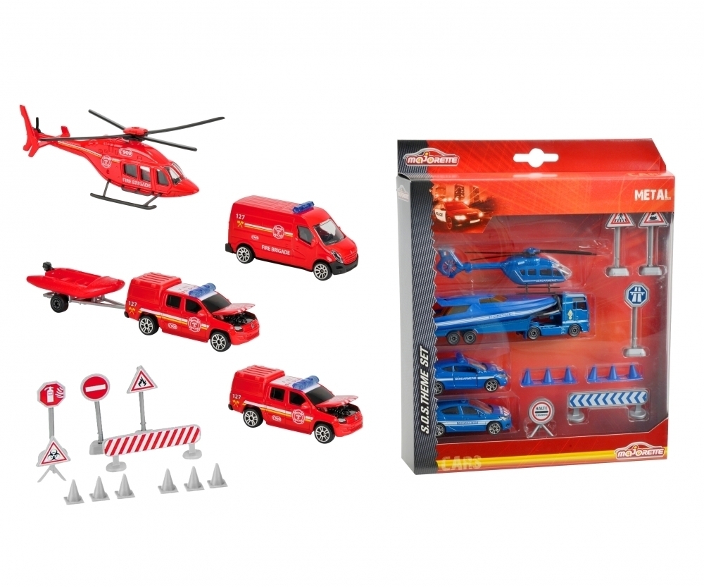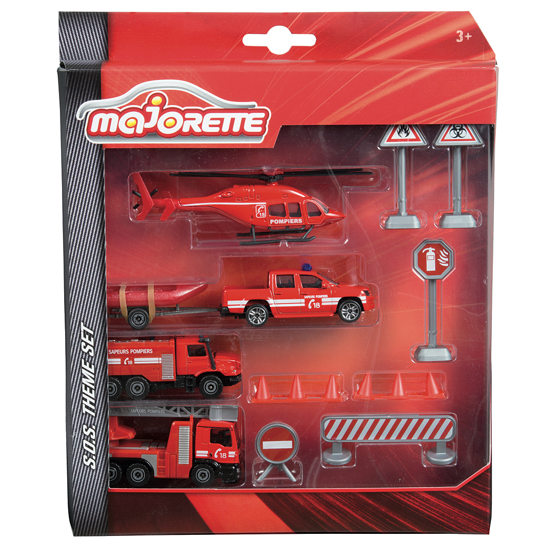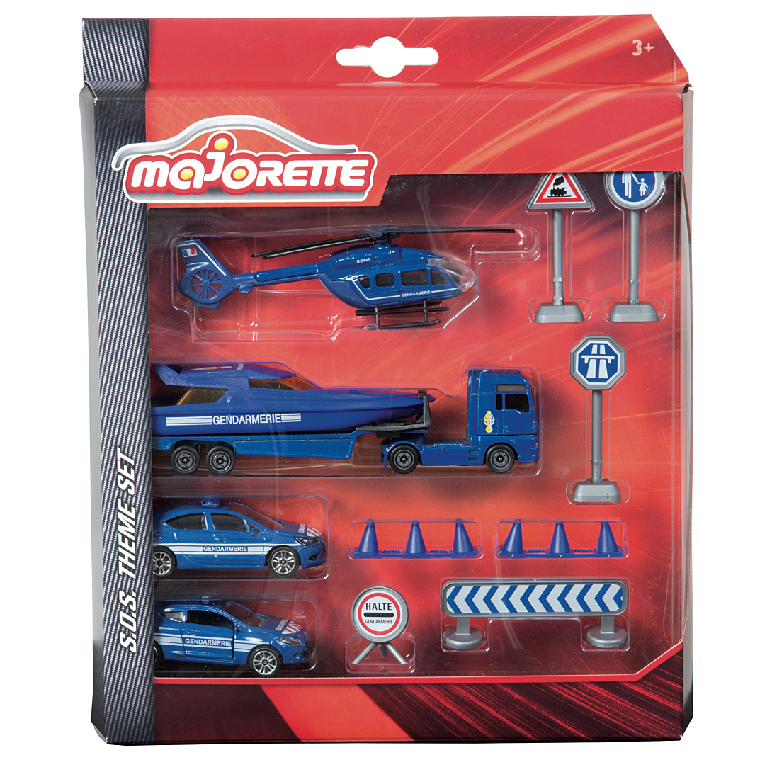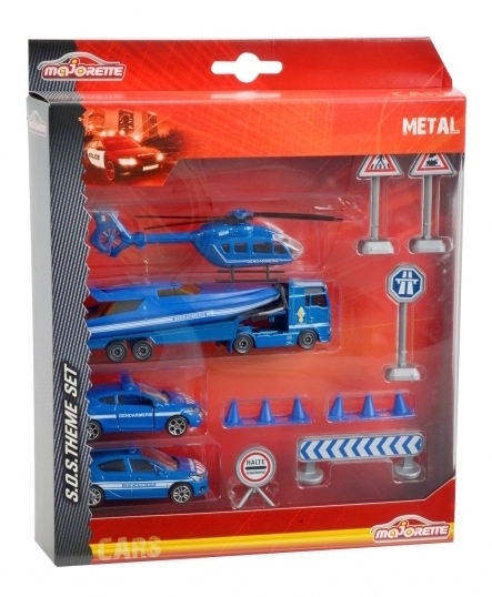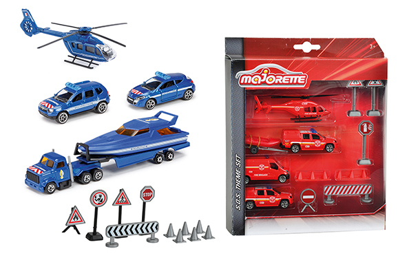 Coffret de véhicules de secours Français. Existe en deux versions : Gendarmerie & Pompiers. Ce coffret contient : - 2 véhicules - 1 hélicoptère - 1 camion avec remorque - 11 accessoires (panneaux circulation, plots, etc)
