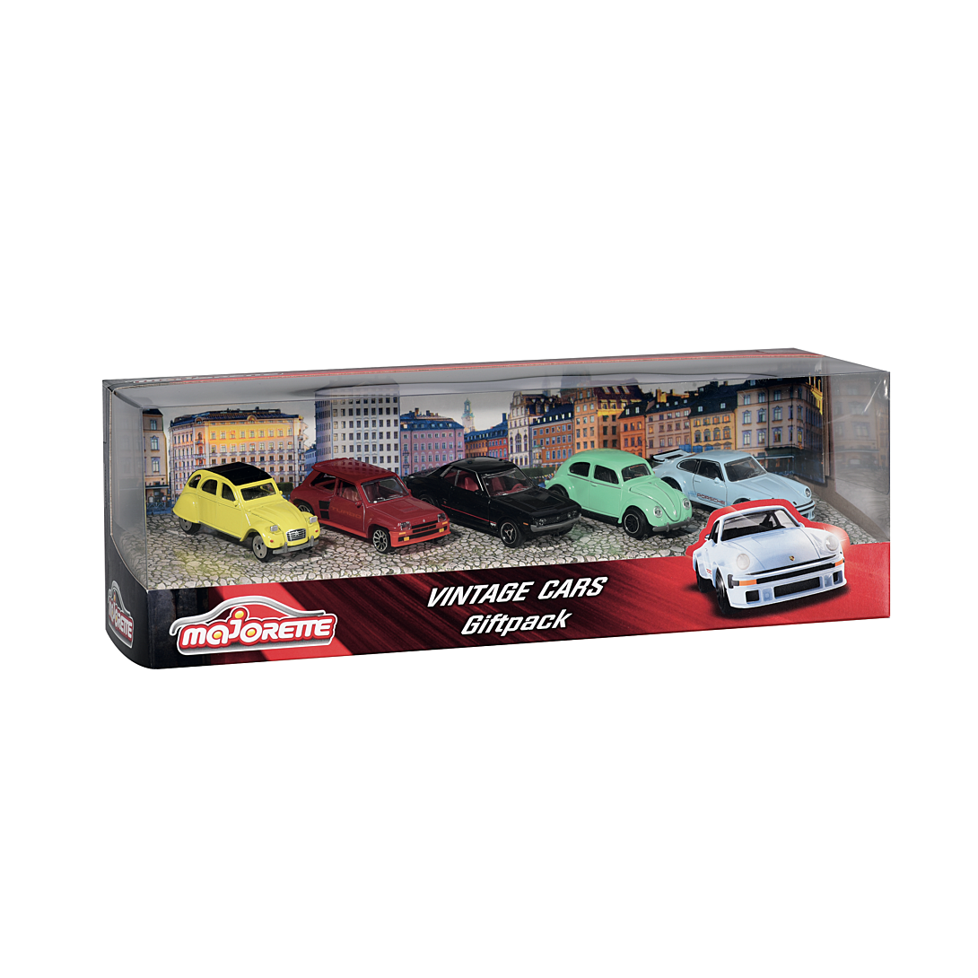 Coffret de 5 véhicules métal à roues libres reproduction originale à l'échelle 1/64ème de modèles Vintage. Coffret comprenant : - Porsche 934 - Renault 5 Turbo - Toyota Celica GT Coupé - VW Cox Kafer - Citroën 2 CV Fonctions de jeu : - portes ouvrantes - phares translucides - suspensions
