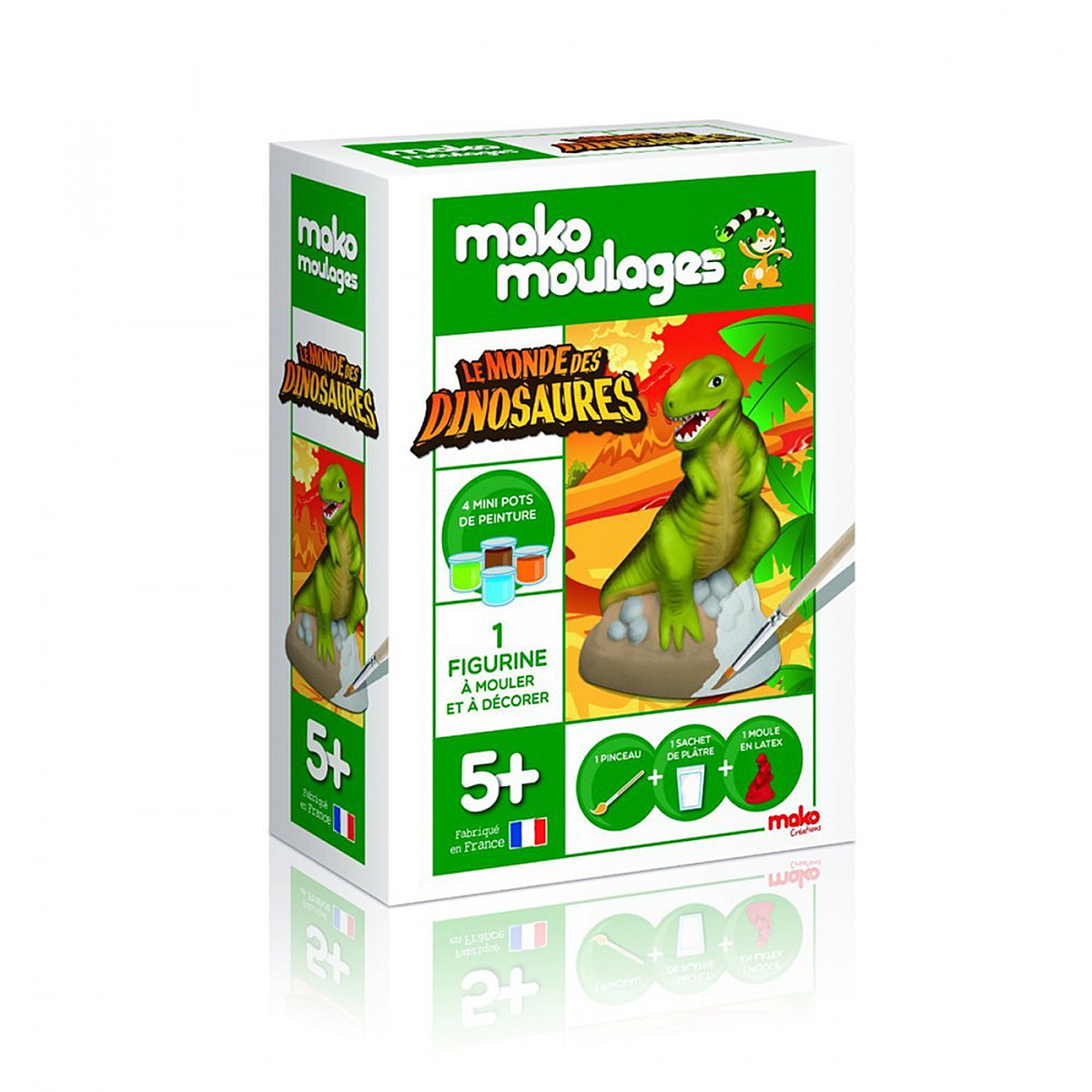 | Plus produit | Kit créatif complet pour mouler et peindre une figurine de Tyrannosaure (moule latex, plâtre, pinceau et 4 mini pots de peinture) — développe la créativité et la motricité fine, fabrication France. |