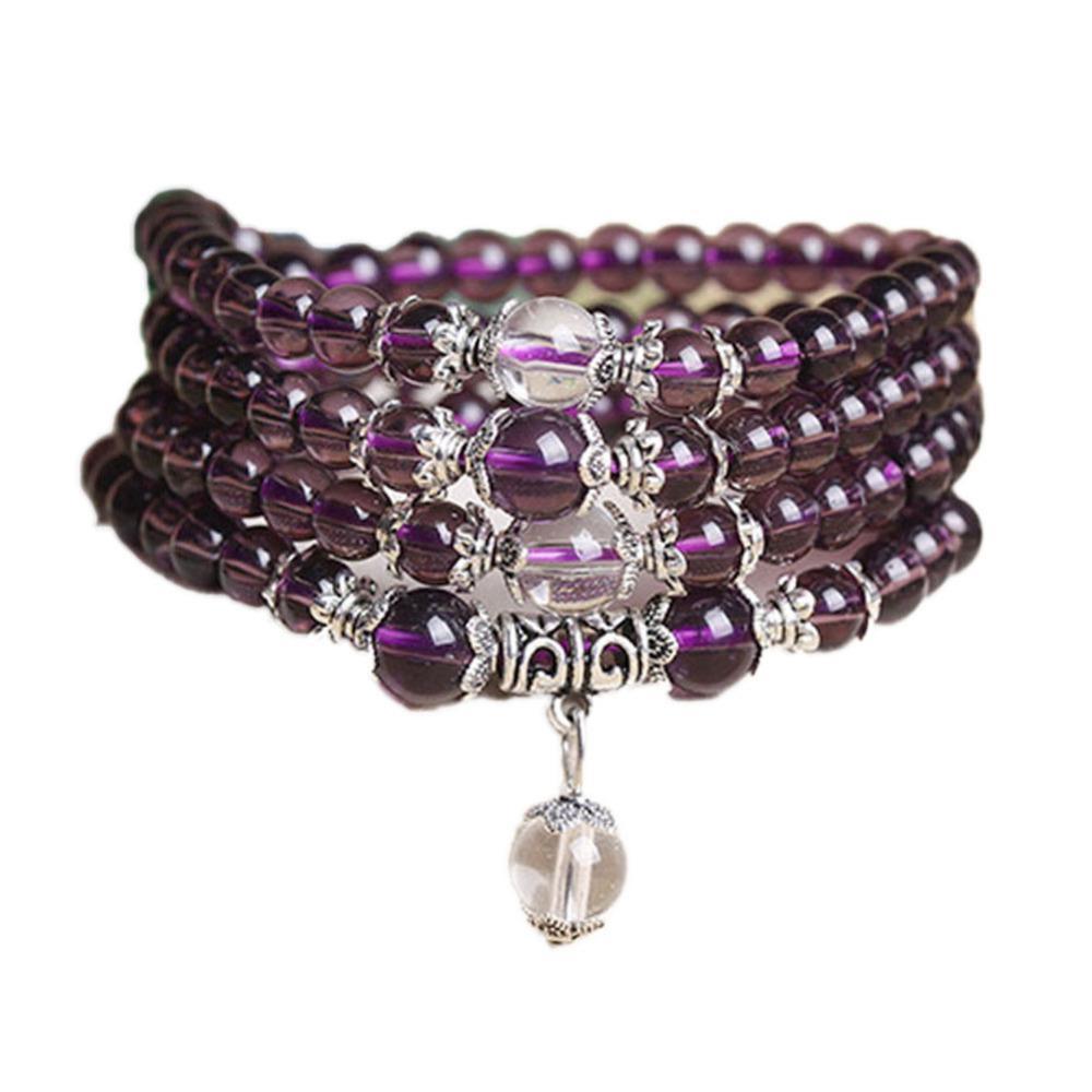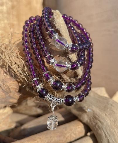 Mâla traditionnel bouddhiste, pouvant se porter en bracelet ou collier, et composé de 108 perles réalisées en perles d'Améthyste.