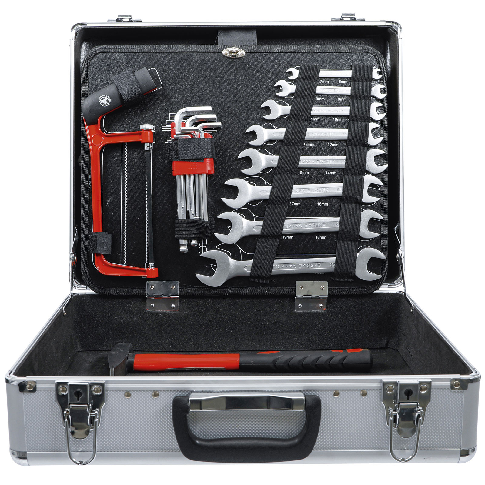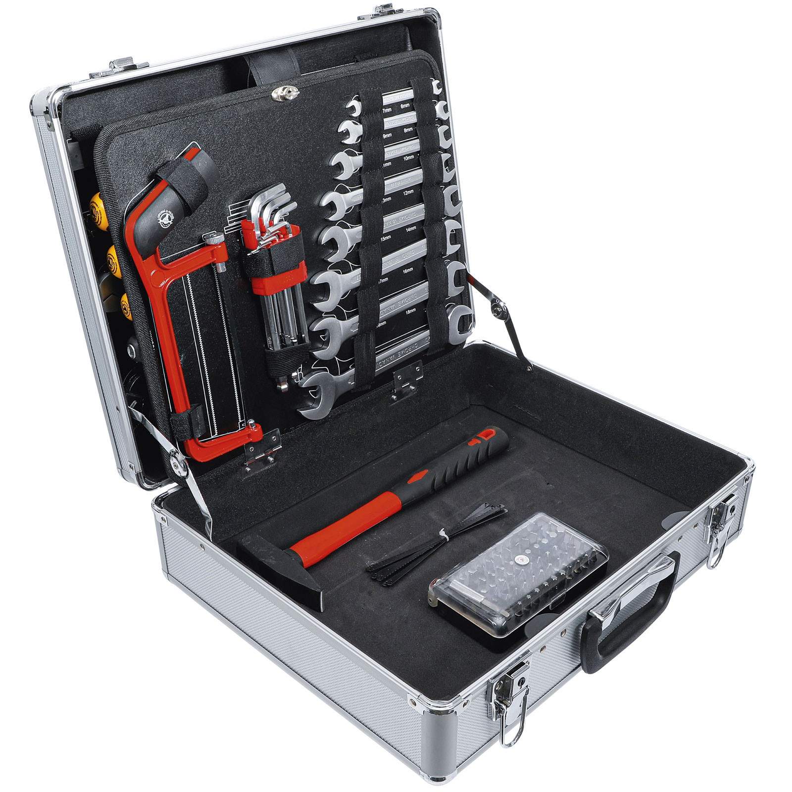 Mallette comprenant : 1 cutter, 155 mm, lame 18 mm 10 lames de rechange pour cutter 18 mm 1 clé à molette, 200 mm 1 pince multiprises, 250 mm 1 pince combinée, 175 mm 1 pince téléphone, 200 mm 1 niveau à bulle, 230 mm 1 mètre ruban, 15 mm x 3 m 1 cliquet réversible, carré d'entrainement 6,3 mm (1/4"), 72 crans 1 rallonge, carré mâle/femelle 6,3 mm (1/4"), 100 mm 1 poignée rotative, transmission 6,3 mm (1/4"), 150 mm 13 douilles hexagonales, transmission par carré mâle de 6,3 mm (1/4") 4 - 4,5 - 5 - 5,5 - 6 - 7 - 8 - 9 - 10 - 11 - 12 - 13 - 14 mm 1 adaptateur d'embouts 6,3 mm (1/4"), transmission par hexagone mâle 6,3 mm (1/4") 19 embouts, 6 pans male, 6,3 mm (1/4"), plats 3 - 8 mm 11 embouts, 6 pans mâle 6,3 mm (1/4"), six pans intérieurs 2- 8 mm 8 embouts, 6 pans mâle 6,3 mm (1/4"), cruciformes PZ0 - PZ3 8 embouts, 6 pans mâle 6,3 mm (1/4"), cruciformes PH0 - PH3 10 embouts, 6 pans mâle 6,3 mm (1/4"), à profil en T (pour Torx) T8 - T40 4 embouts, 6 pans mâle 6,3 mm (1/4"), carré 2- 3,5 mm 1 adaptateur d'embouts, 6 pans mâle/femelle 6,3 mm (1/4") 1 tournevis plat de précision 2,5 x 50 mm 1 tournevis cruciforme de précision PH00 x 50 mm 3 tournevis plat 5,5 x 75 mm, 6,5 x 100 mm, 8 x 125 mm 1 testeur de tension, 100 - 250 V 2 tournevis cruciforme PH1 x 75 mm, PH2 x 100 mm 1 poignée rotative pour embouts, transmission par six pans intérieurs 6,3 mm (1/4") 1 scie à main, 260 mm, y compris 7 lames de scie 9 clés coudées, six pans creux, à tête sphérique, 1,5 - 2 - 2,5 - 3 - 4 - 5 - 6 - 8 - 10 mm 8 clés plate chromée mate, 6 x 7 - 8 x 9 - 10 x 11 - 12 x 13 - 14 x 15 - 16 x 17 - 18 x 19 - 20 x 22 mm 1 marteau mécaniciens, 300 g.| EAN | 3701524007861 |