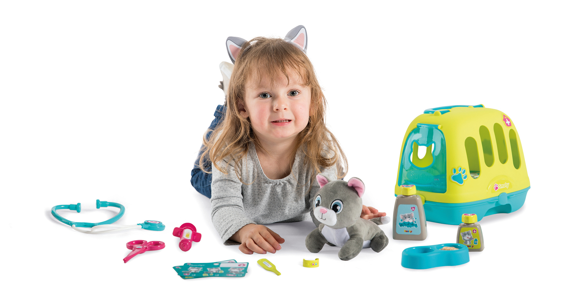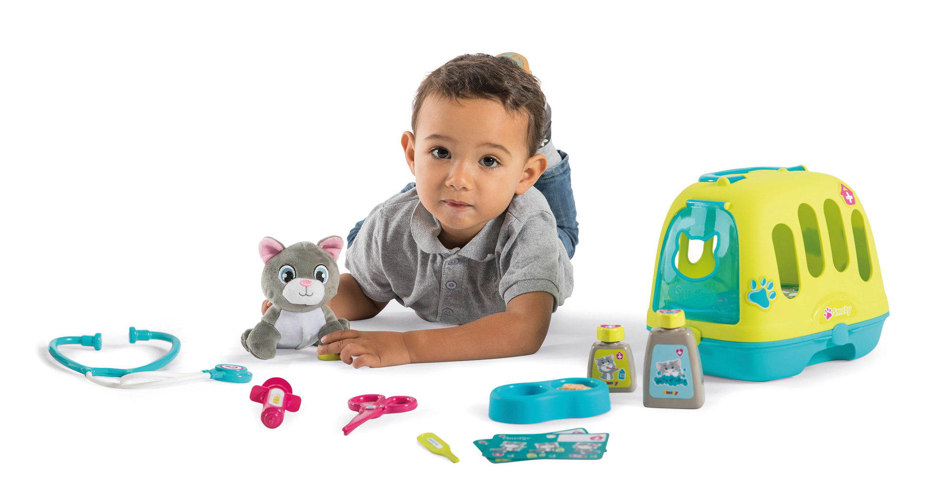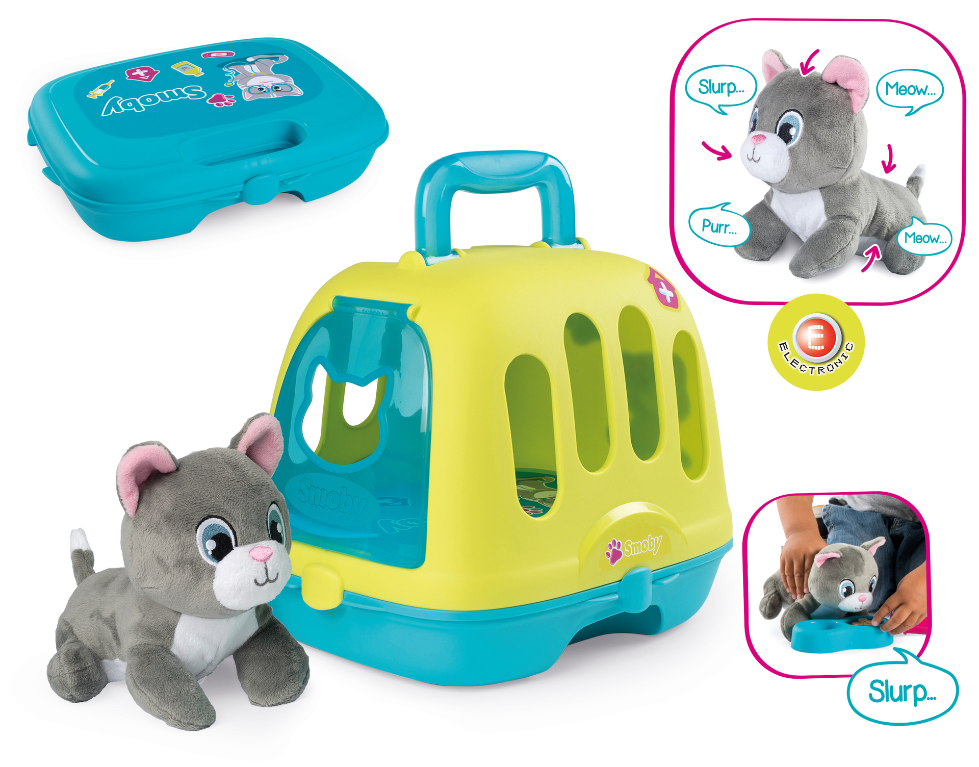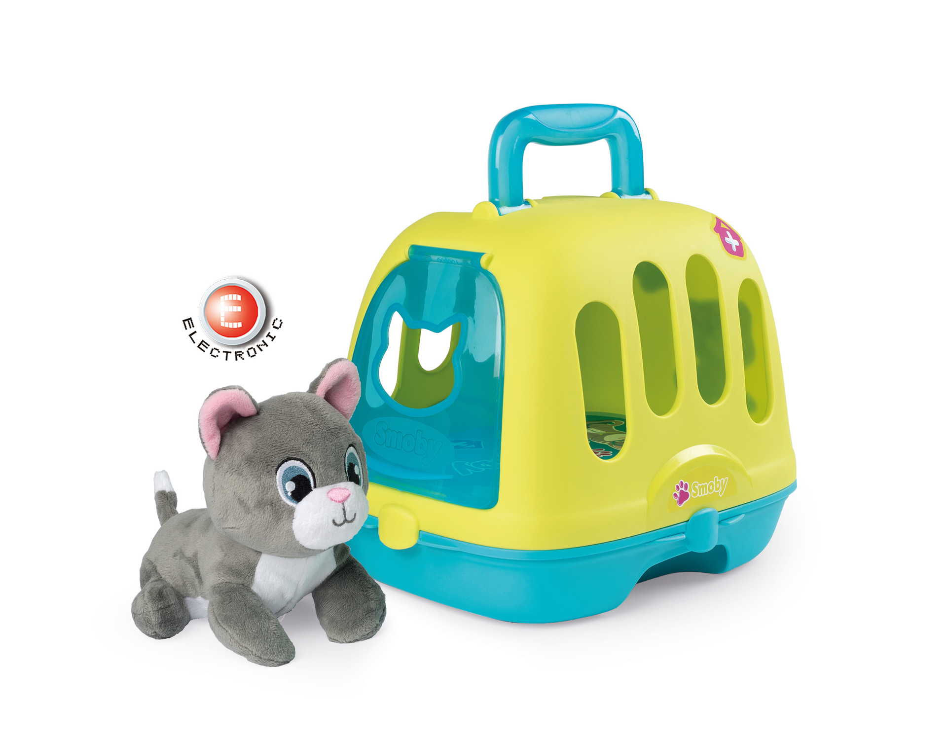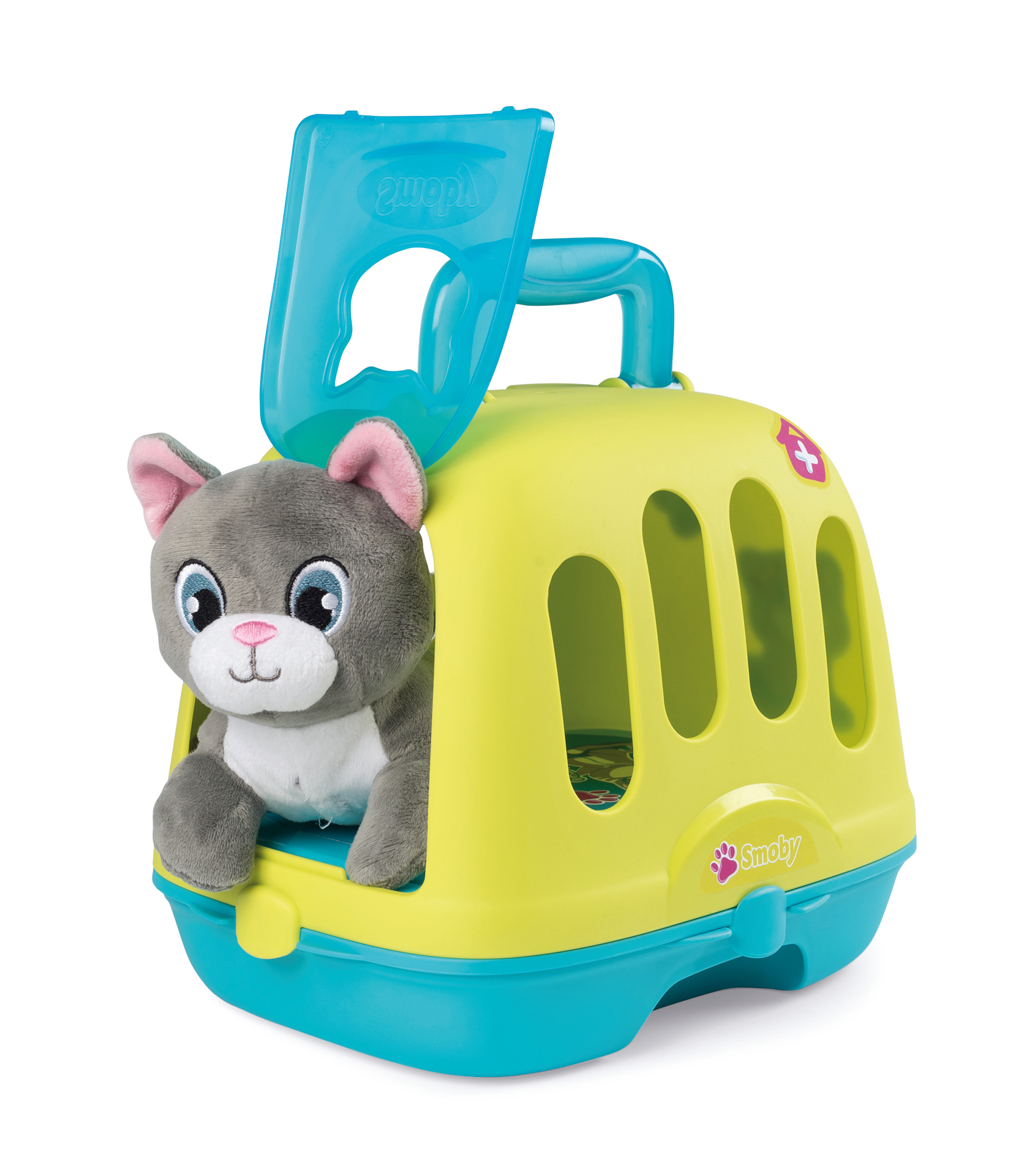 | Plus produit | Produit 2 en 1 : Cage de transport et mallette de vétérinaire. 1 peluche chaton avec effets sonores incluse. Nombreux accessoires : gamelle, croquettes, stéthoscope, seringue |
