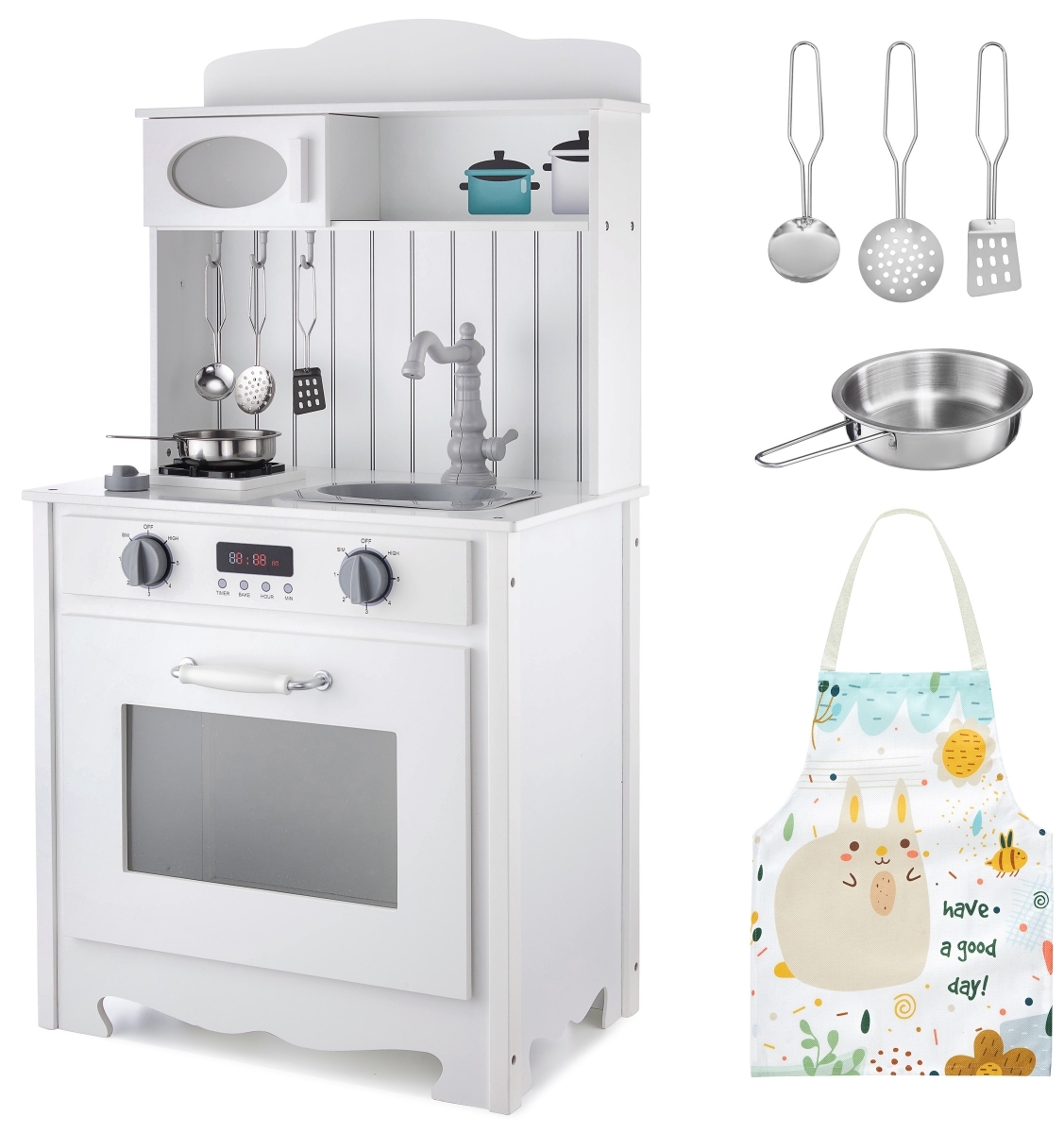 Les appareils ménagers tels que le four, la plaque de cuisson et le micro-ondes sont très similaires aux vrais, de sorte que les enfants peuvent pleinement assumer le rôle d'adultes. Tout ce que le petit doit faire c'est d'enfiler le tablier chef offert avec la cuisine et la partie de plaisir peut commencer !