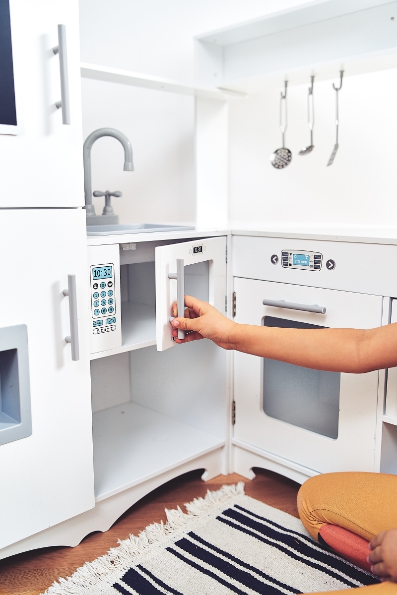 La cuisine est parfaite pour un jeu en solo ou en groupe. Son design en bois est unique et les pièces mobiles ont été fabriquées avec grand soin, coins arrondis sans arêtes vives. Elle est toute équipée. Sa couleur blanche correspond à tous les intérieurs et plaira aux filles comme aux garçons. De grandes dimensions, disposition en L comme dans une vraie cuisine d'adultes, un espace de jeux idéal à partager avec la fratrie ou les copains.