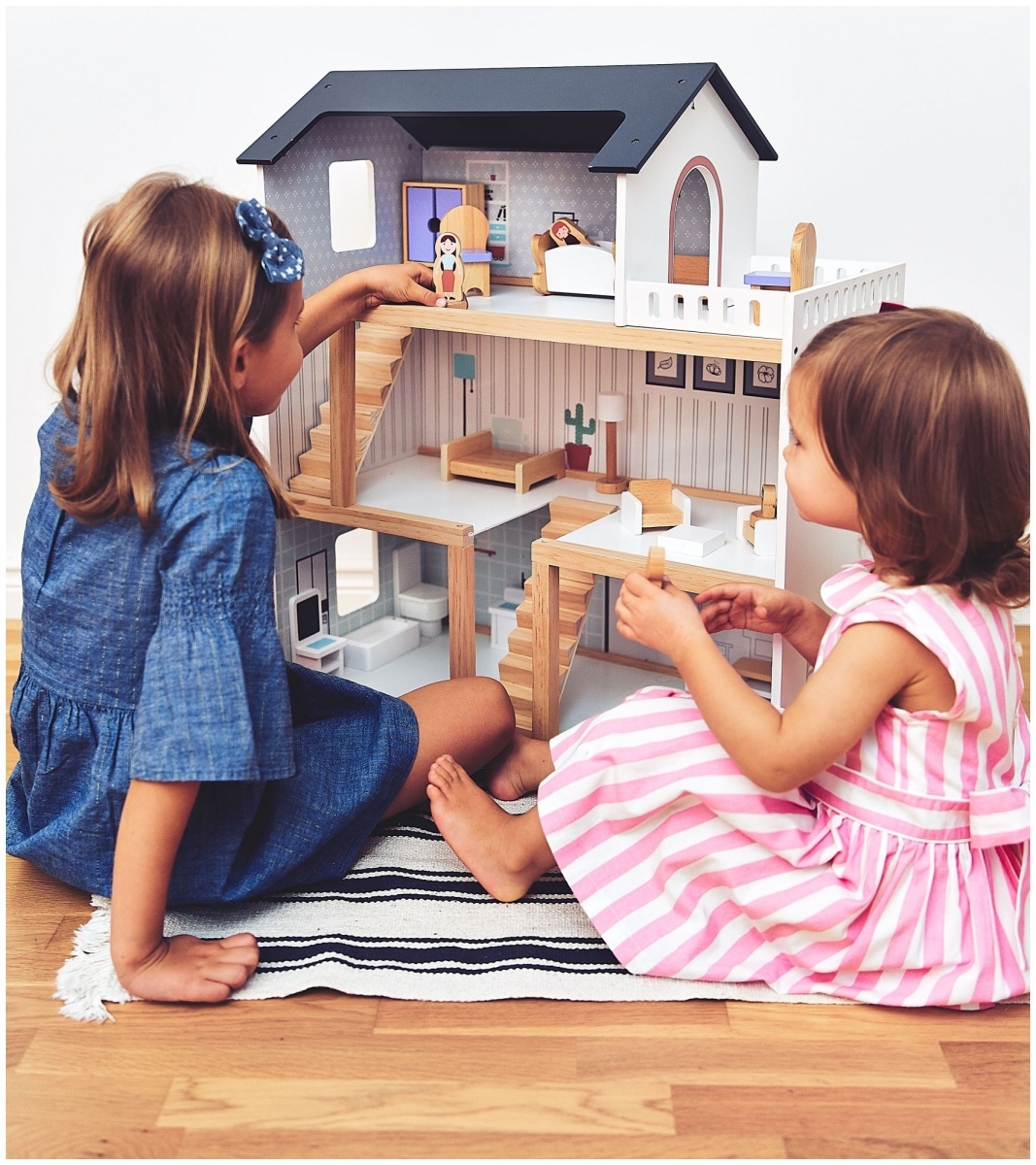 Mamabrum Maison de Poupées en Bois avec Grande Terrasse 4 Figurines, 3 Etages, 2 Chambres, Cuisine, Salon
