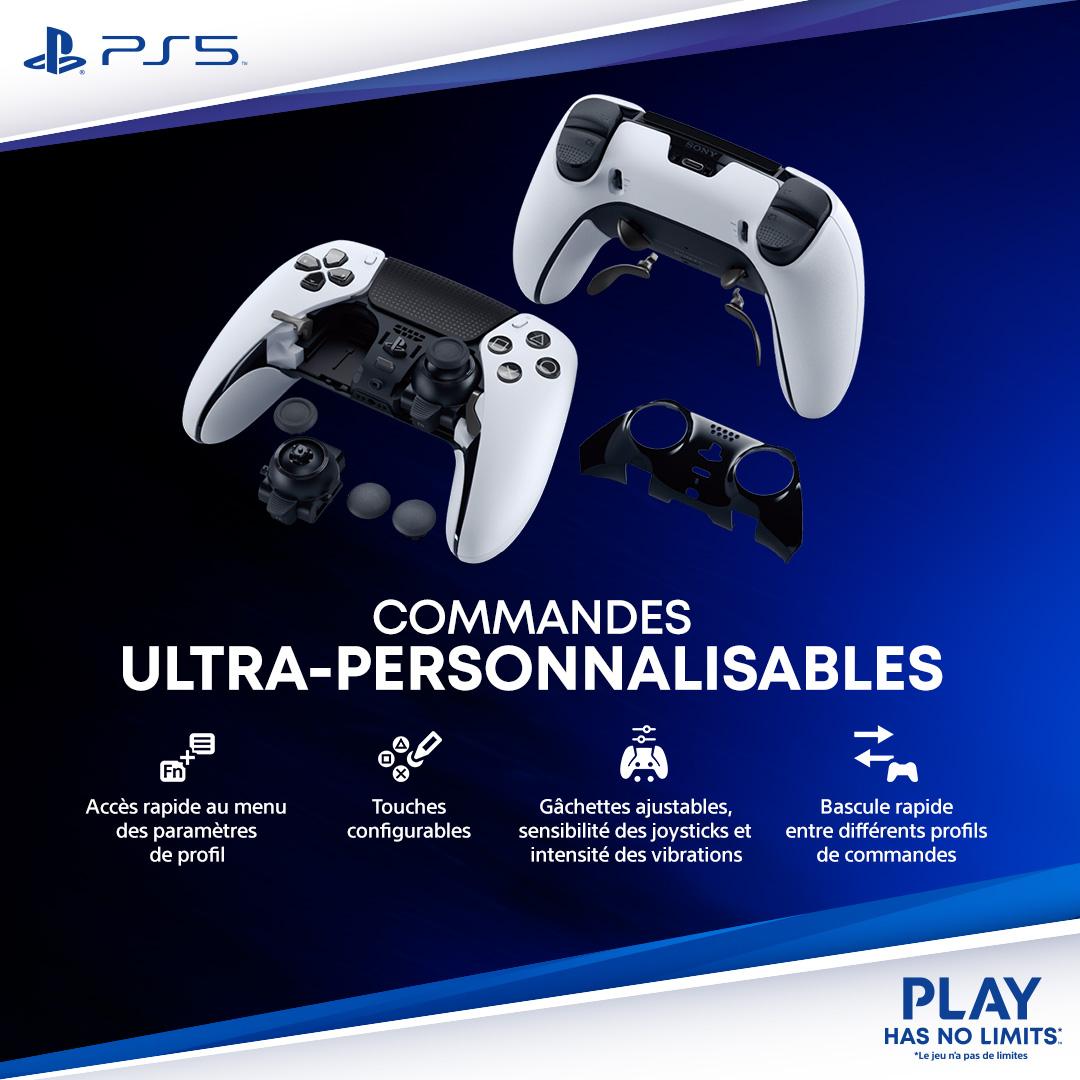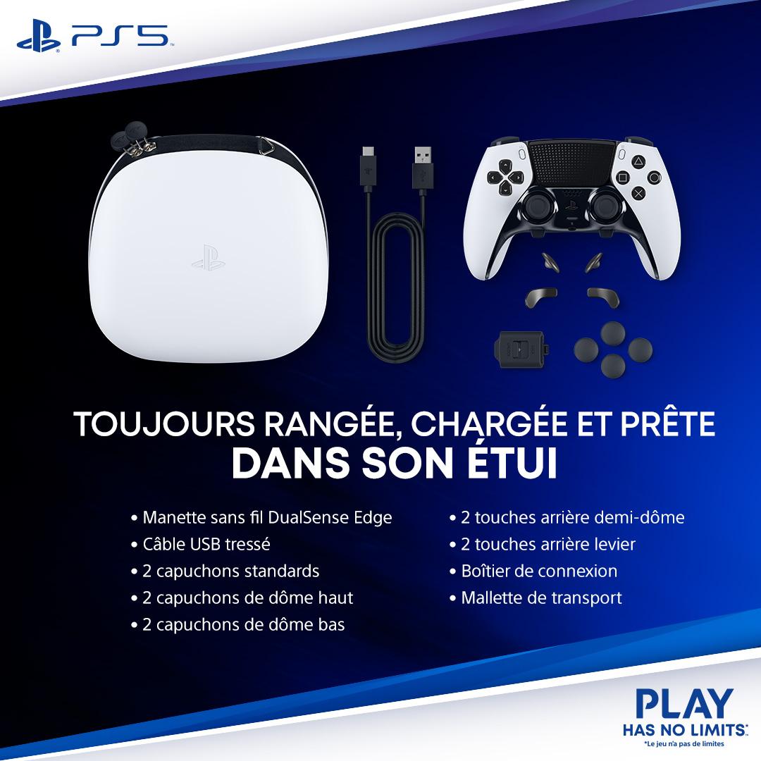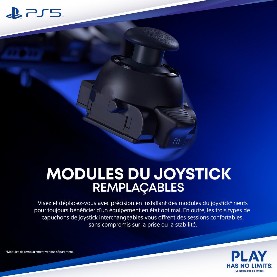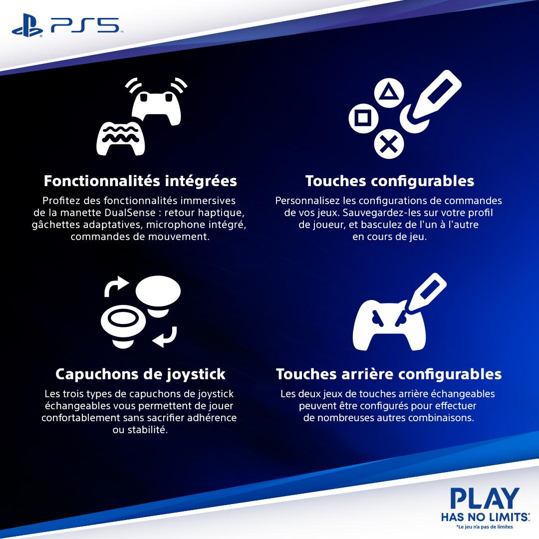 Manette sans fil DualSense Edge(TM) Conçue pour offrir de hautes performances et une personnalisation optimale, cette nouvelle manette pour PS5 vous invite à créer votre propre expérience de jeu unique. Perfectionnez votre façon de jouer Trouvez votre avantage avec les commandes personnalisables et les profils interchangeables qui vous permettent de vous préparer aussi bien à des tournois professionnels qu'à des aventures épiques en solo. Commandes ultra personnalisables Les paramètres personnalisés vous offrent la possibilité de créer une manette sans fil DualSense Edge à votre image. Explorez certaines des fonctionnalités principales de la manette de jeu avec les icônes clignotantes ci-dessous: Capuchons de joystick échangeables Les trois types de capuchons de joystick échangeables vous permettent de jouer confortablement sans sacrifier adhérence ou stabilité.