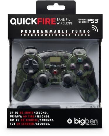 Prenez l'avantage et chassez vos adversaires avec la manette sans fil « Quick Fire* » de Bigben Interactive. Caractéristiques Manette sans fil pour jeux PS3(TM) 5 modes préréglés du « Quick Fire* » pour vos jeux favoris. Affichage LCD. De 6 tirs par secondes jusqu'à 60 tirs par seconde. Programmez le « Quick Fire* » sur n'importe quel bouton d'action. Capteurs de mouvements (3 axes) et vibrations. Ergonomique et gâchettes de tir antidérapantes. Motif camouflage Fourni avec 2 piles alcalines AA. *tir rapide.