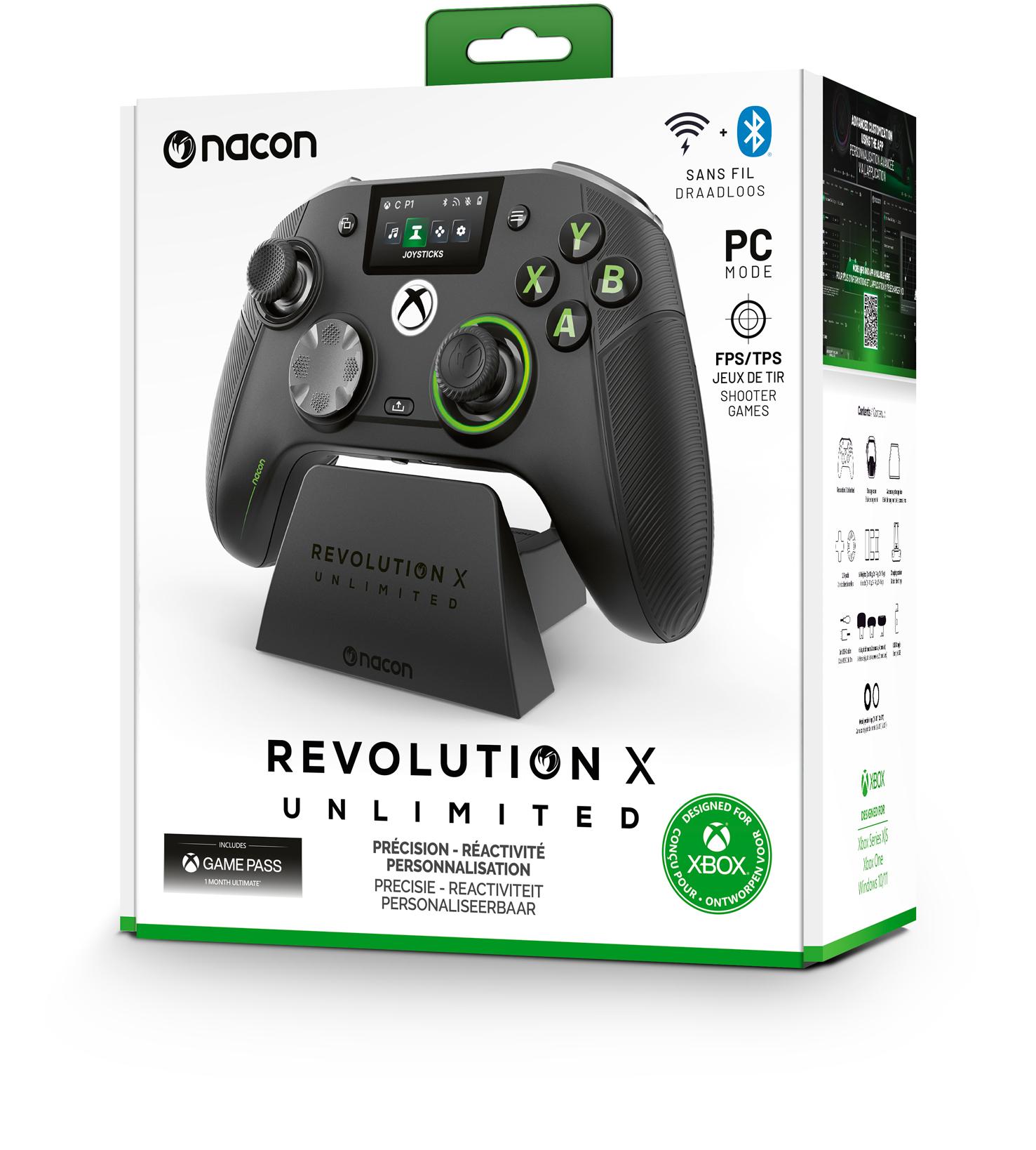MANETTE SANS FIL DE PRÉCISION NACON REVOLUTION X UNLIMITED POUR XBOX, PC OPTIMISÉE POUR LES JEUX DE TIR FPS/TPS ET STATION DE CHARGE. - Instant triggers : Gâchettes ajustables instantanées avec composants micro-switch. - Précision mécanique : Composants micro-switch pour un gameplay ultra-réactif. - Personnalisation via écran LCD : Customisations, mapping programmation et un mixage faciles et intuitifs des sources audio. - Technologie Hall Effect magnétique : joysticks et gâchettes bénéficiant d'une précision et d'une durabilité grandement accrues grâce à un effet magnétique, évitant le «joystick drift». - Connectivité : Sans fil via USB pour une latence minimale (RadioFréquence 2.4 Ghz). Sans fil via Bluetooth compatible avec appareils Android, SmartTV, casques audio. Connexion filaire également possible (câble tressé de 3m).