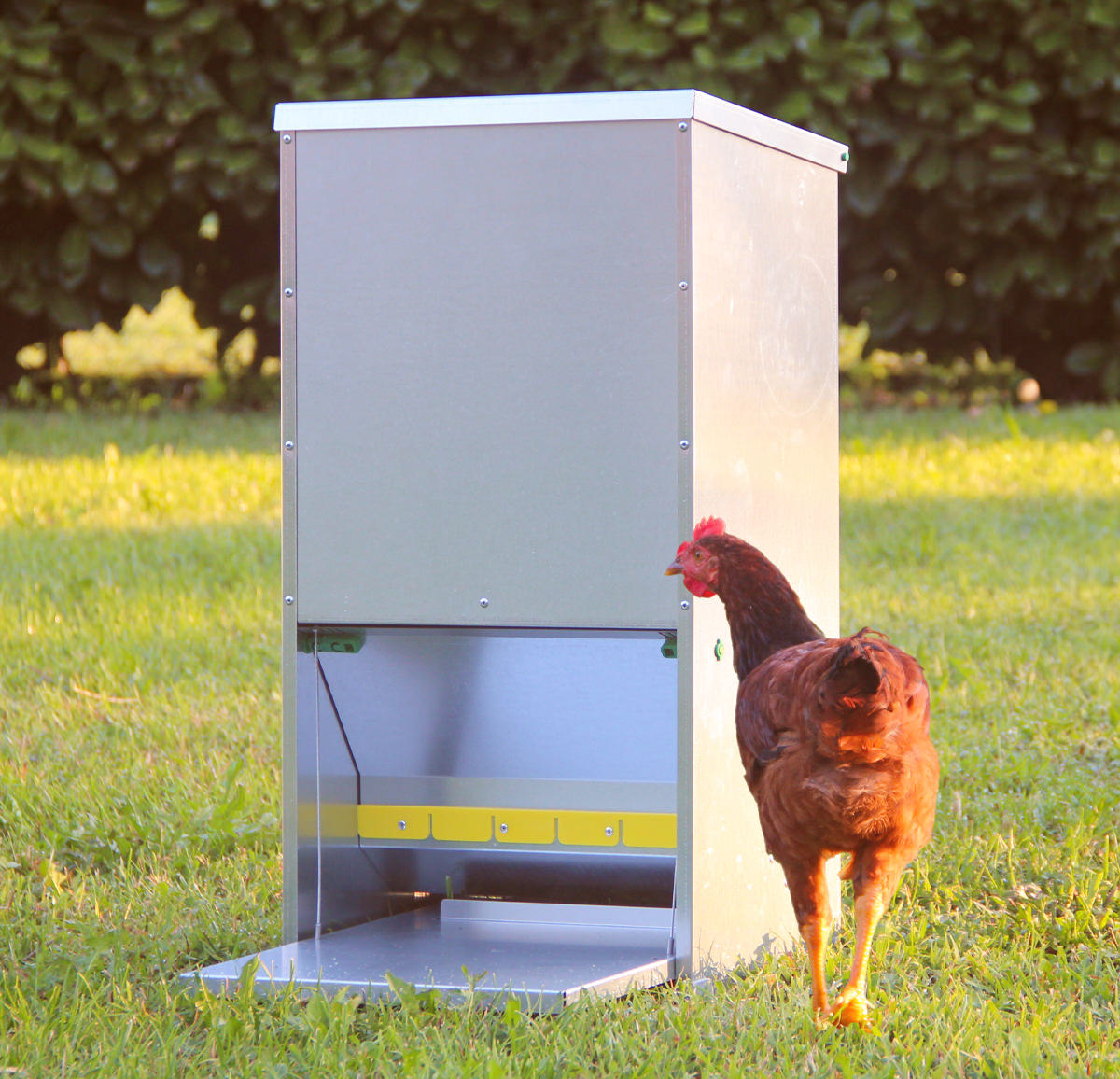 A l'intérieur, un séparateur anti-gaspillage empêche les volailles de faire tomber au sol la nourriture. Elle est à l'abri de la pluie et est inaccessible aux oiseaux, souris ou autres nuisibles, évitant ainsi la prolifération de saletés et de maladies. La mangeoire dispose de 12 réglages de poids pour l'ouverture de la trappe : de 300 g à 1100 g.