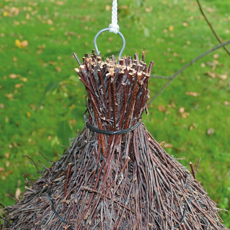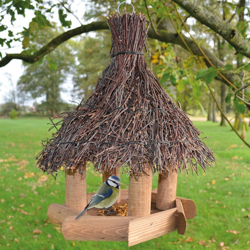 Le bois de pin utilisé rend le nichoir massif et durable. Le toit en broussaille attire particulièrement les oiseaux à la recherche de petites brindilles pour leur nid et protège de l'humidité d'en haut. Le nichoir Sweet Home peut être accroché à l'anneau ci-dessus.