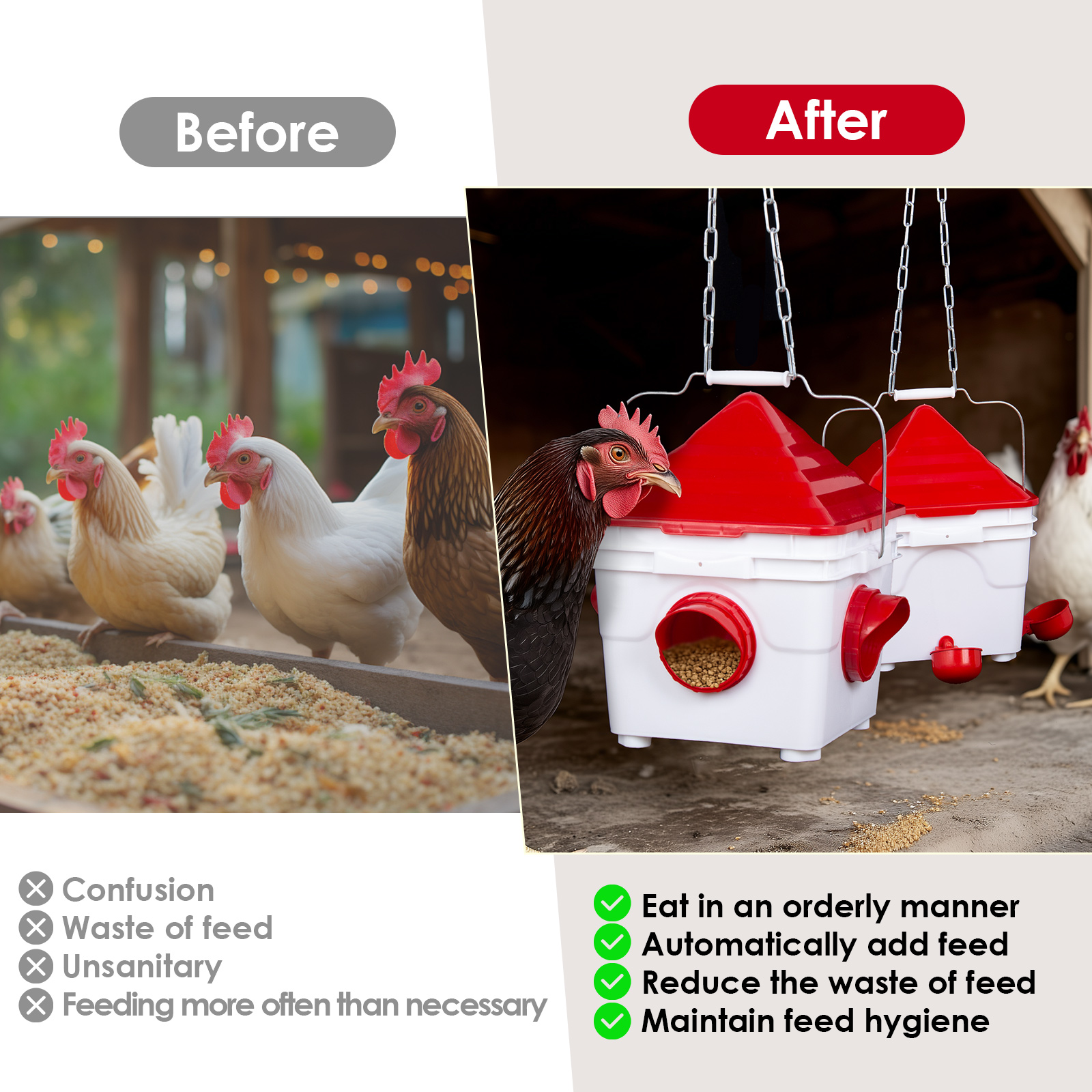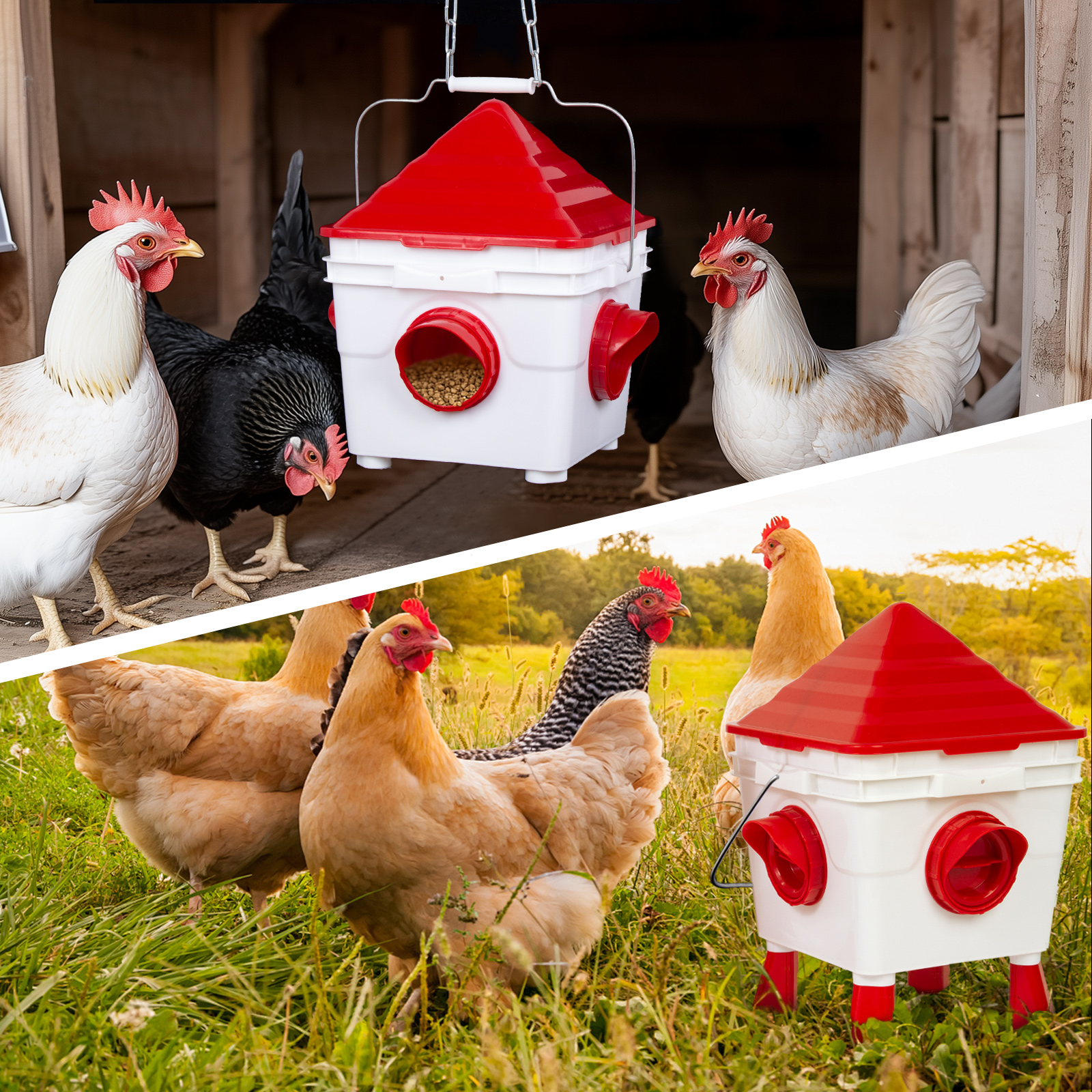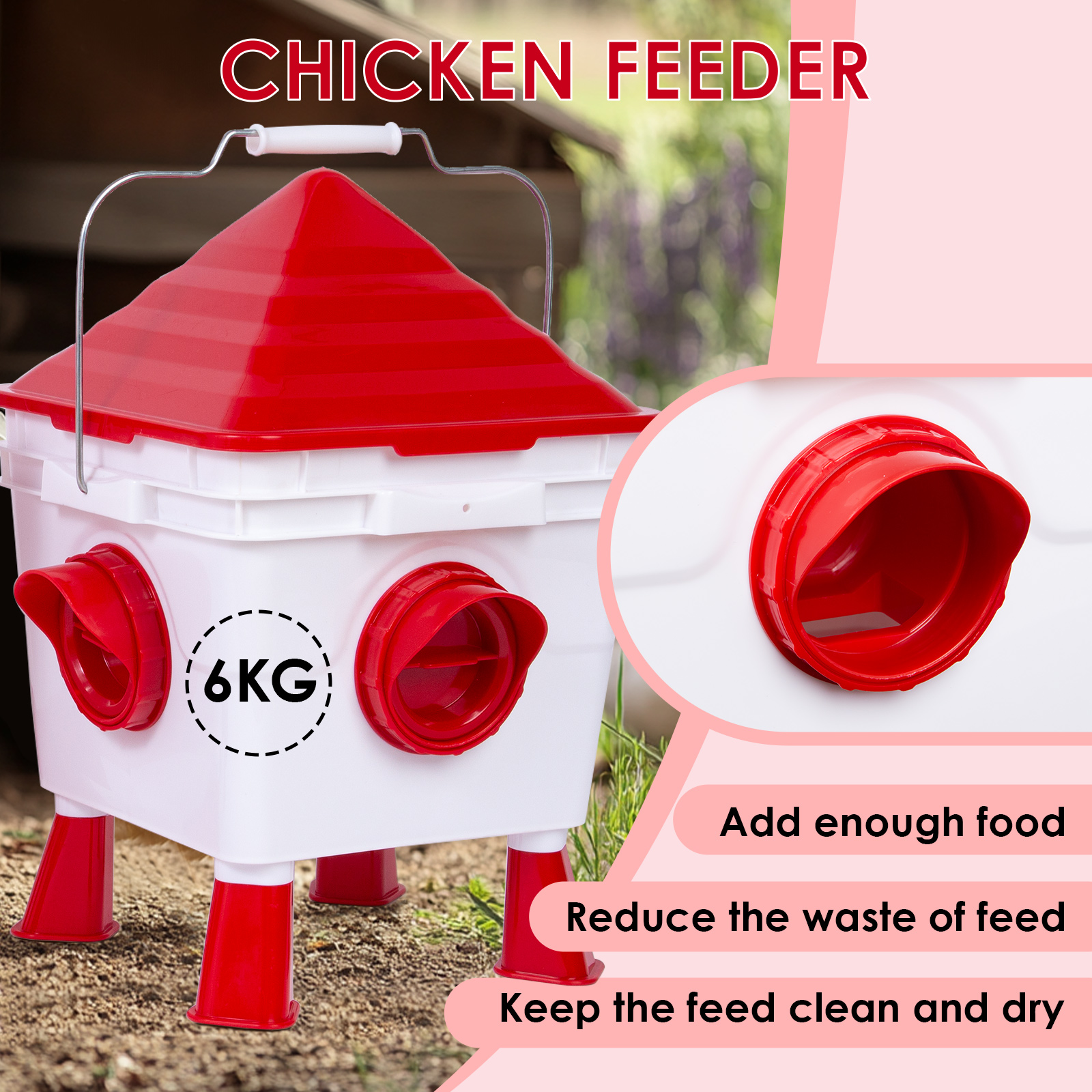 Mangeoires pour Poules Sans Gaspillage et Imperméables - La mangeoire pour poules est équipée d'un couvercle qui maintient la nourriture propre. La mangeoire à port aide également à éviter les déversements, empêche vos poules de gaspiller la nourriture et vous fait économiser de l'argent. Le design du capot de pluie de chaque port maintient la nourriture au sec. La mangeoire pour poules peut contenir jusqu'à 6 kg de nourriture.