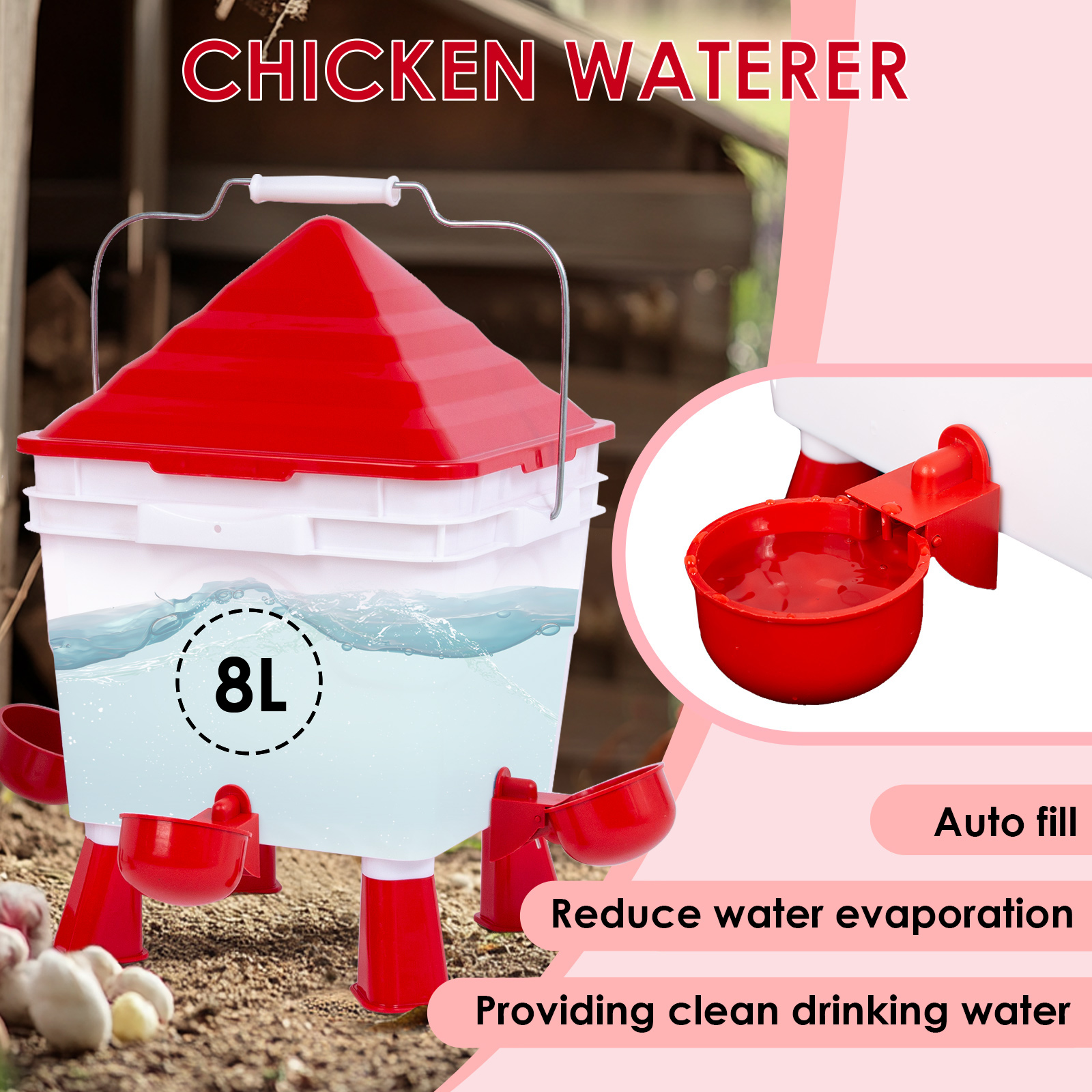 Système de Remplissage Automatique d'Eau - Cet abreuvoir automatique pour poules est idéal pour les propriétaires de poules occupés qui n'ont pas le temps de remplir constamment leur abreuvoir. De plus, l'abreuvoir pour poules peut contenir jusqu'à 8 kg d'eau, fournissant aux poules un accès à de l'eau fraîche et propre en permanence.