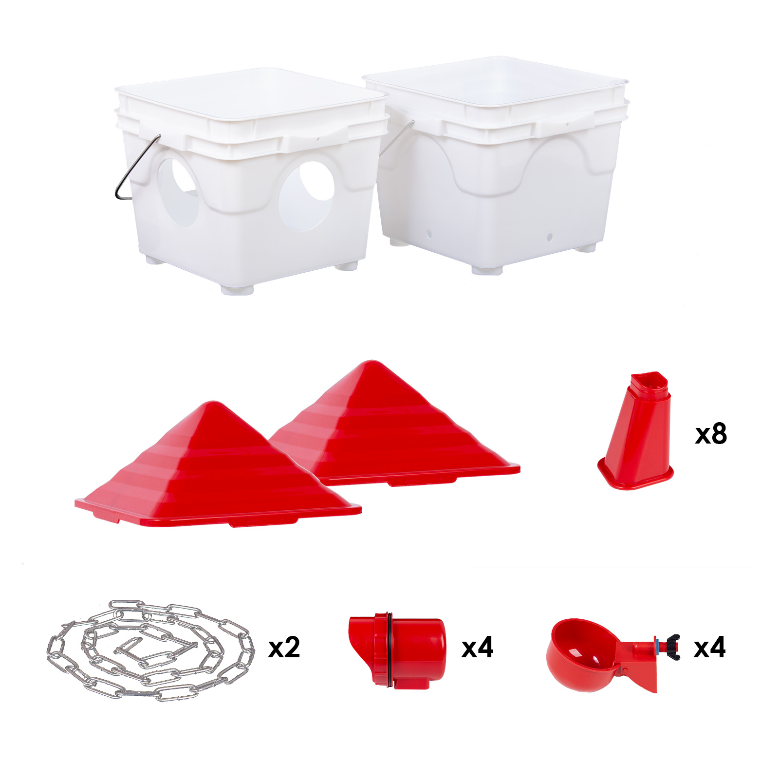 Passer le carrousel d'imagesEnsemble de Mangeoire et Abreuvoir pour Poules - L'ensemble de mangeoire automatique est un excellent moyen de s'assurer que vos poules sont toujours bien nourries. Les quatre trous permettent à plus d'oiseaux de boire ou de manger en même temps. Les capuchons anti-perchoir protègent non seulement contre la pluie, mais empêchent également vos poules de se percher sur le dessus.