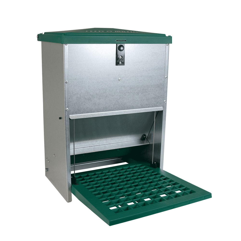 L'accès à la nourriture s'effectue seulement lorsque la volaille monte sur la pédale en plastique, activant ainsi l'ouverture de la trémie. La pédale en plastique est ajourée, évitant ainsi l'accumulation de nourriture ou de fientes sur celle-ci.