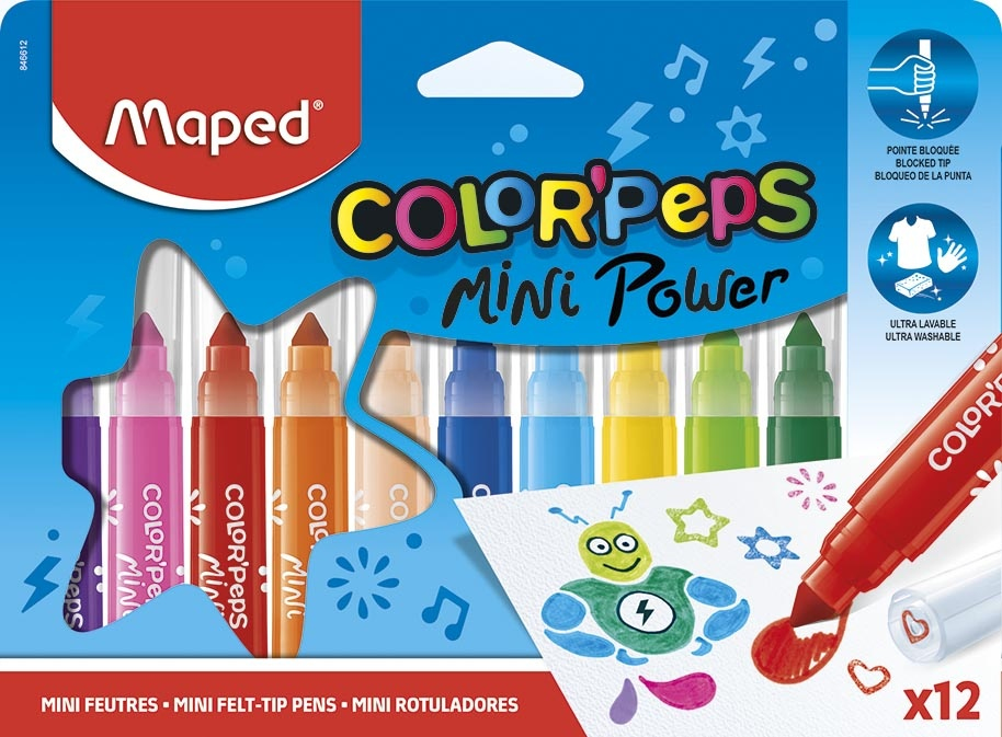 Les feutres Mini Power de la gamme Color'Peps sont conçus pour faciliter la prise en main des enfants grâce à leur gros corps. Ils disposent d'une encre ultra-lavable pour un nettoyage facile, que ce soit sur la peau ou sur du textile. . IGros feutres de coloriage Mini Power idéal pour les petites mains ! N'ayez plus peur de confier des feutres à vos enfants grâce à ces feutres ultra-lavables spécialement conçus pour eux. Vos enfants vont pouvoir laisser libre court à leur imagination !