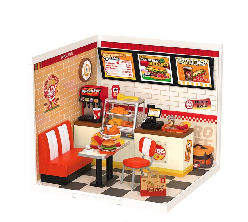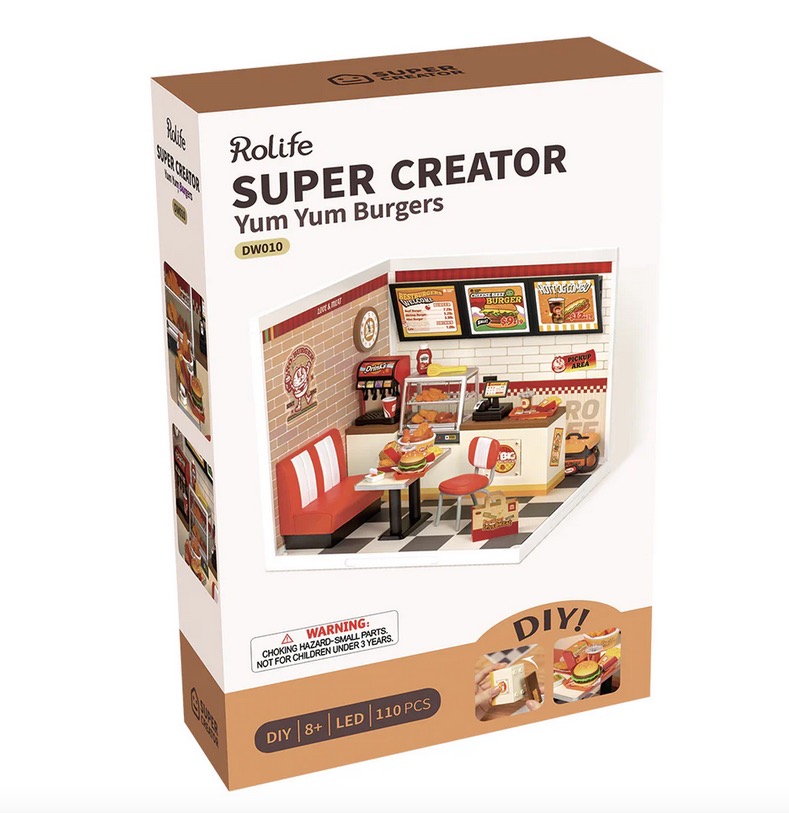 La série Rolife Super Creator vous invite à concevoir votre propre monde de petites boutiques où votre savoir-faire méticuleux et votre créativité sans limite sont pleinement exposés. Ce n'est pas seulement une démonstration de votre talent, mais un portail vers un autre monde où les sentiments sont évoqués : l'excitation, l'anticipation, la concentration, la détente et la satisfaction. Yum Yum Burgers vous ramène à un lieu d'amitié et de jeunesse où manger est l'excuse parfaite pour se réunir et rire. Rolife a conçu les détails fins de cette boutique avec soin pour que vous puissiez vous immerger dans ce monde et raconter votre histoire de manière vivante. Construisez seul ou avec un ami, Yum Yum Burgers est facile à faire et amusant à réaliser. Alors que de plus en plus de personnes découvrent et apprécient la série Super Creator, nous élargissons continuellement la collection pour offrir plus de joie. Il y a toujours un puzzle Rolife pour tout le monde !