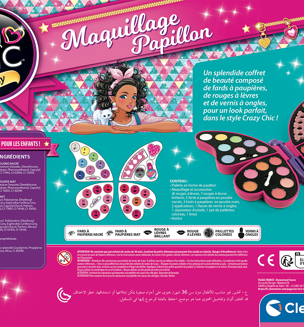 | Avertissements | Attention ! Ne convient pas aux enfants de moins de 36 mois. Contient de petits éléments qui peuvent être avalés ou inhalés. Danger d'étouffement. Attention. Ne convient pas aux enfants de moins de 6 ans. À utiliser sous la surveillance d'un adulte. Tenir ce jeu/coffret hors de portée des enfants de moins de 6 ans. Éloigner les jeunes enfants et les animaux de la zone destinée au jeu. Certaines personnes pourraient ressentir dans certains cas des symptômes d'hypersensibilité. Appliquer d'abord une petite quantité de produit à l'intérieur du poignet et la retirer 30 minutes plus tard. Ne pas utiliser le cosmétique en cas d'irritation. Ne pas utiliser sur des peaux excoriées ou irritées. Attention. Contient des substances parfumantes susceptibles de causer des allergies. Benzoate de benzyle. Attention ! Peut contenir des traces de substances susceptibles de causer des allergies. Chrome, nickel. |